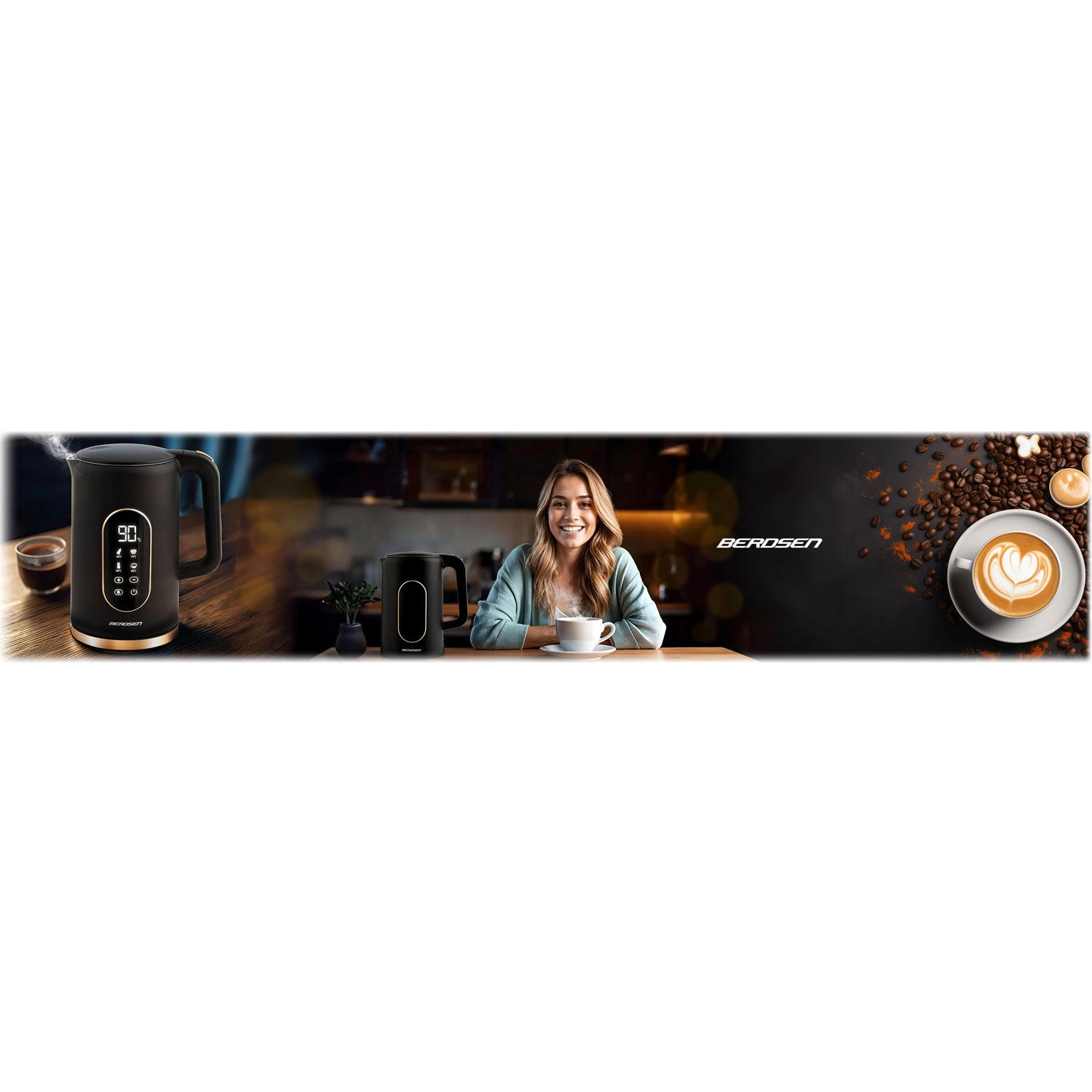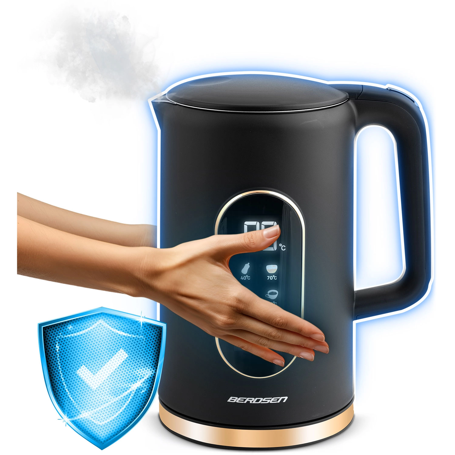 Slogoven električni grelnik vode 1,7 l znamke BERDSEN združuje eleganten črno‑zlat dizajn s pametnimi funkcijami. Ponuja natančno nastavitev temperature po 5 °C s prednastavitvami 40/70/80/90/100 °C, zaslon na dotik z LED osvetlitvijo in funkcijo Keep Warm do 2 ur. Dvoslojno ohišje CoolTouch™ zagotavlja varen dotik, nerjavno notranjost SUS 304 za čist okus vode in moč do 2200 W za hiter in tih grelni cikel.
