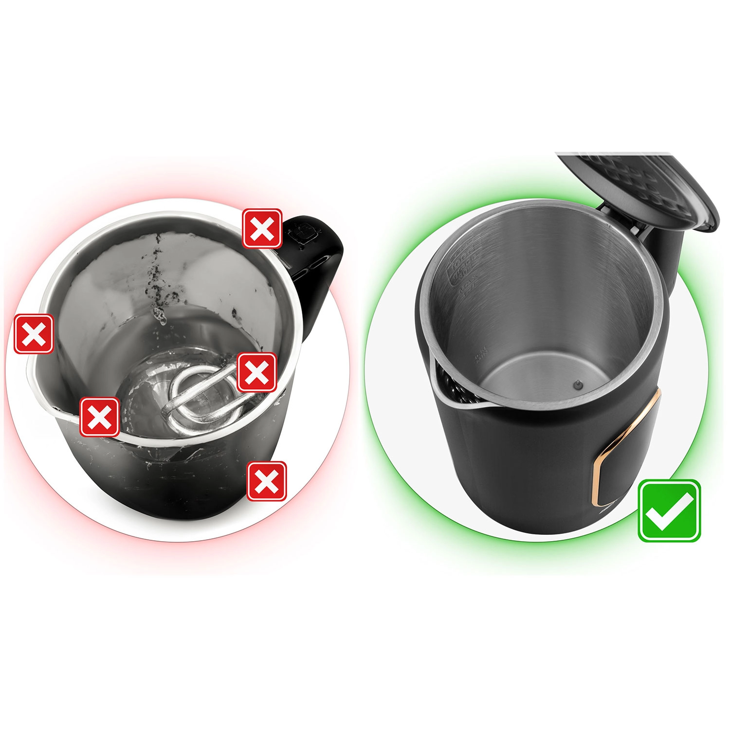 Za varnost in udobje skrbita dvoslojna konstrukcija CoolTouch™ (nerjavno jeklo + kakovostna plastika), ki se od zunaj ne pregreva, ter zanesljiv samodejni izklop z zaščito pred suhim delovanjem. Nerjavno notranje ohišje SUS 304 je trpežno, higiensko in brez BPA – za čistejšo vodo in daljšo življenjsko dobo aparata.
