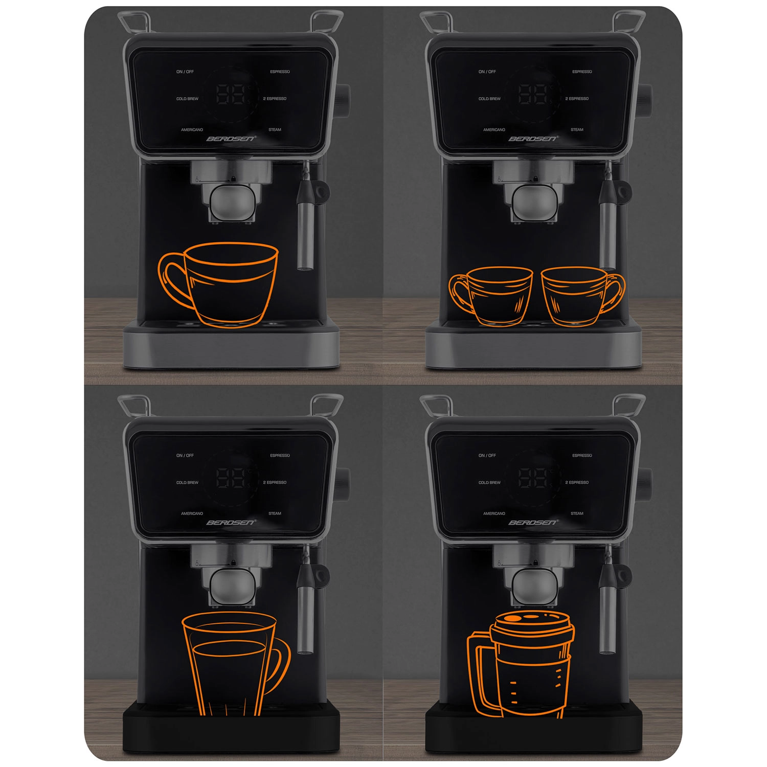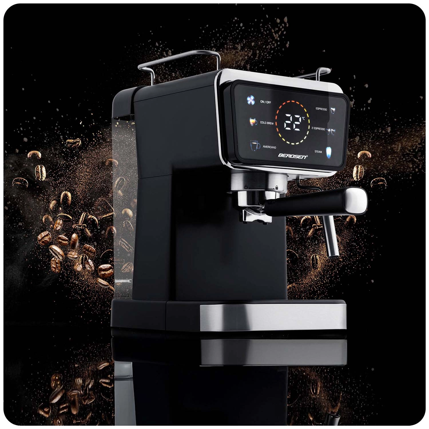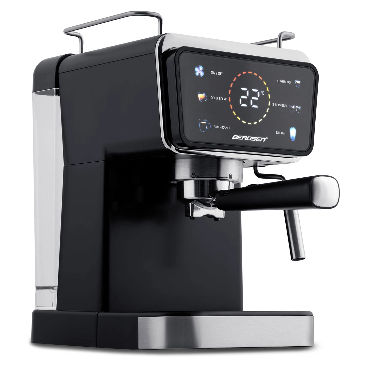 Spremenite svojo kuhinjo v domačo kavarno. Ročni kavni aparat Berdsen združuje zmogljivo 20-barno črpalko in natančen sistem ekstrakcije za intenzivno aromo, poln okus in popolno kremo. Upravljalna plošča na dotik ponuja hitro izbiro funkcij espresso, para in hladni espresso, medtem ko profesionalna parna šoba ustvari gosto, žametno peno za cappuccino, latte ali flat white.