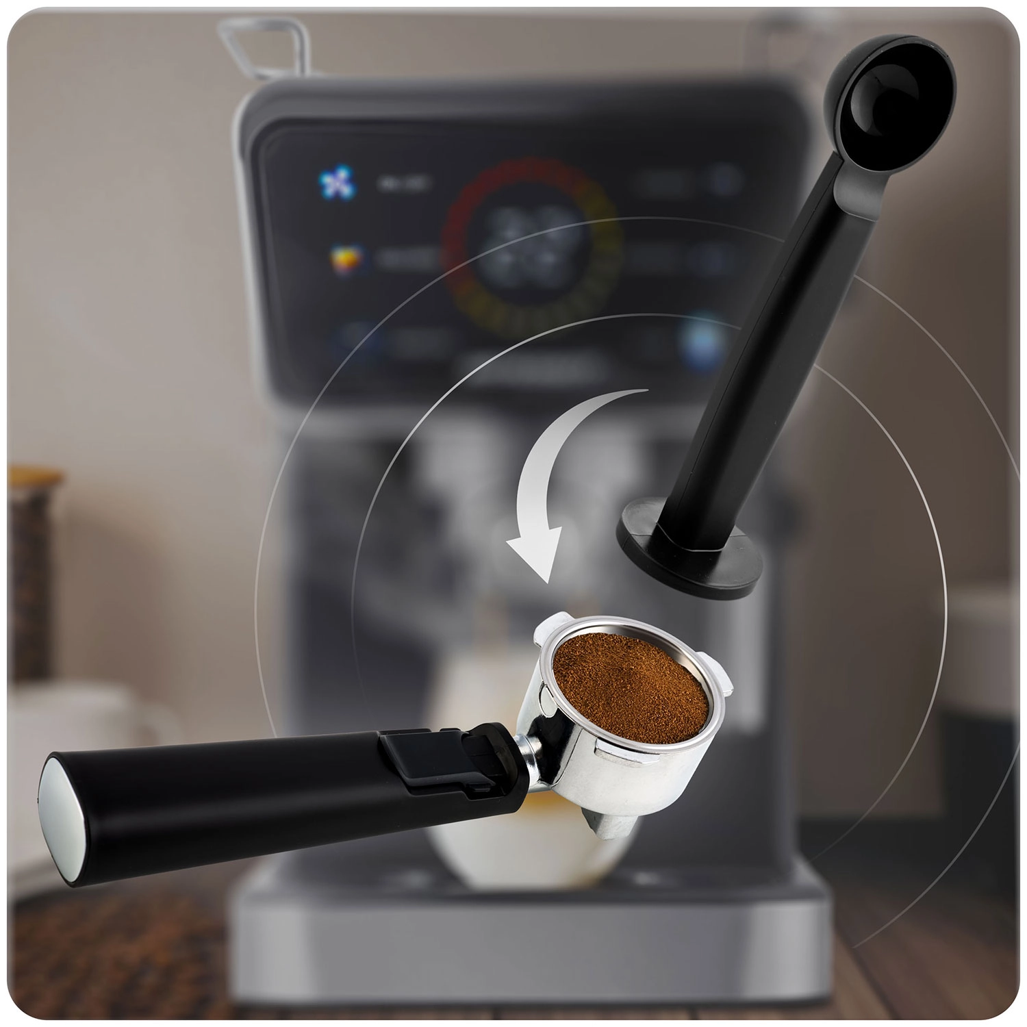 Praktična oprema vključuje dva nerjaveča filtra (single in double), ročico z dvojnim izlivom ter 2-v-1 merico s tamperjem za natančno doziranje in enakomerno tlačenje. Odstranljiv odcejalni pladenj omogoča uporabo tudi višjih kozarcev in termo lončkov, medtem ko se 1,5-l rezervoar za vodo enostavno polni in čisti. Tih tek, kakovostna izdelava in varne protizdrsne nogice povečajo vsakodnevno udobje.