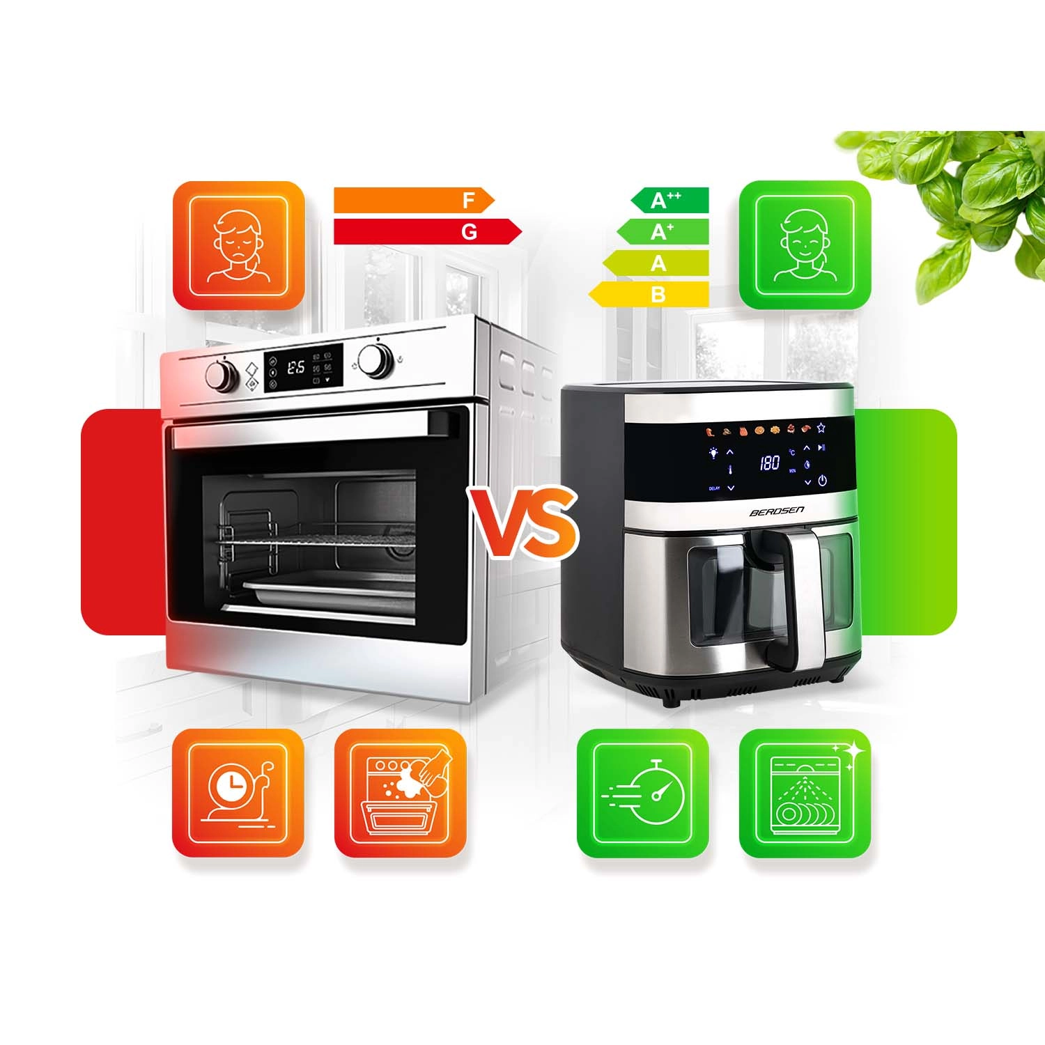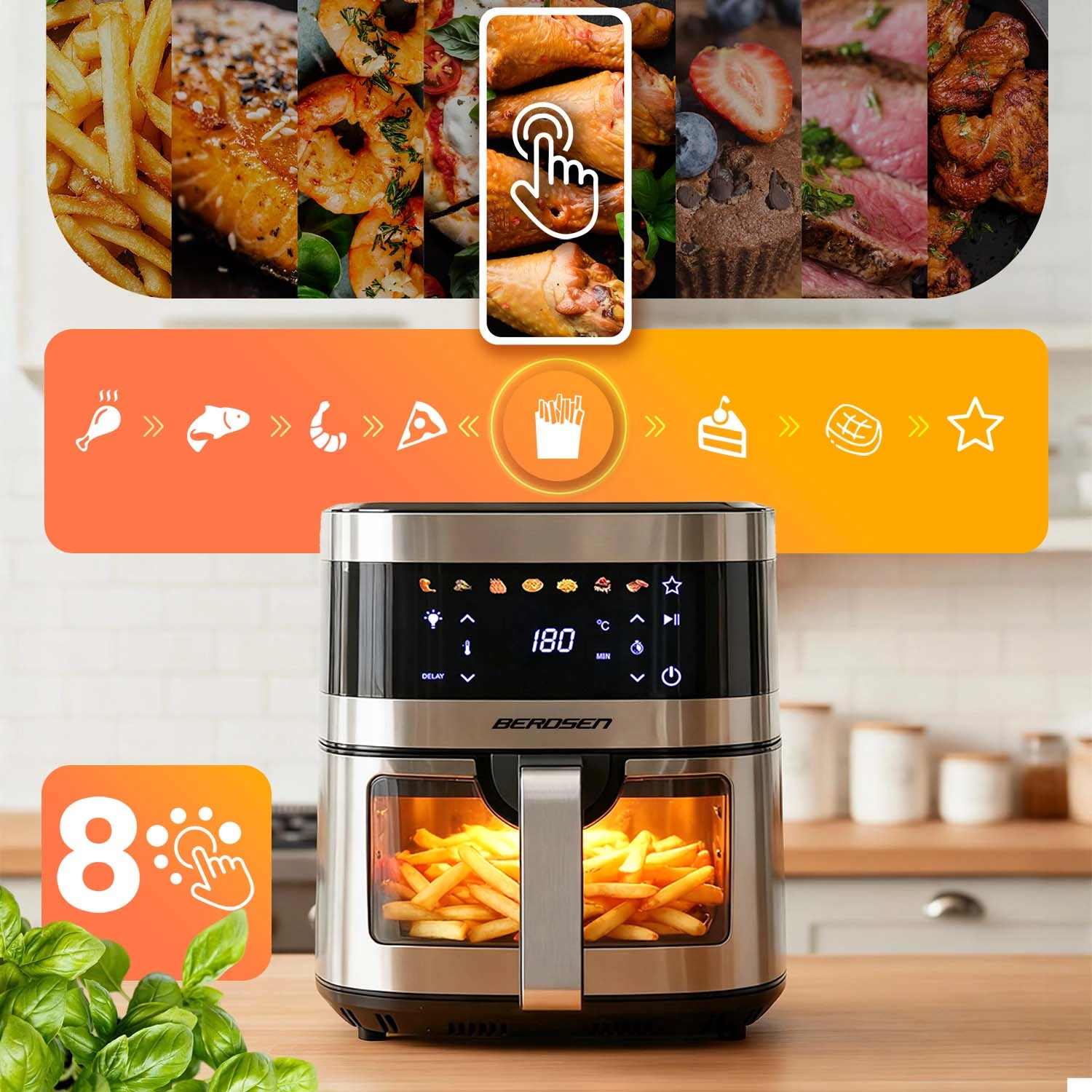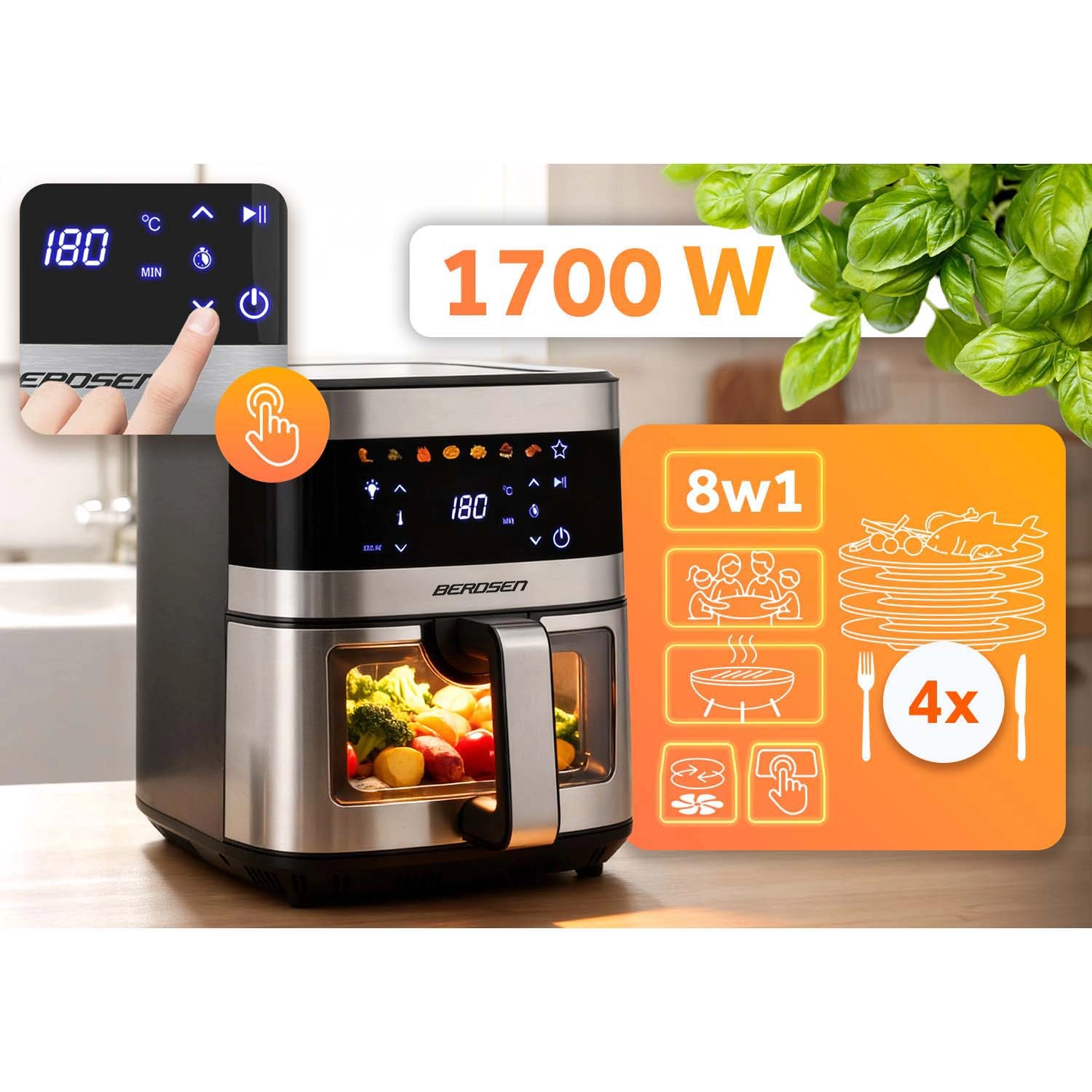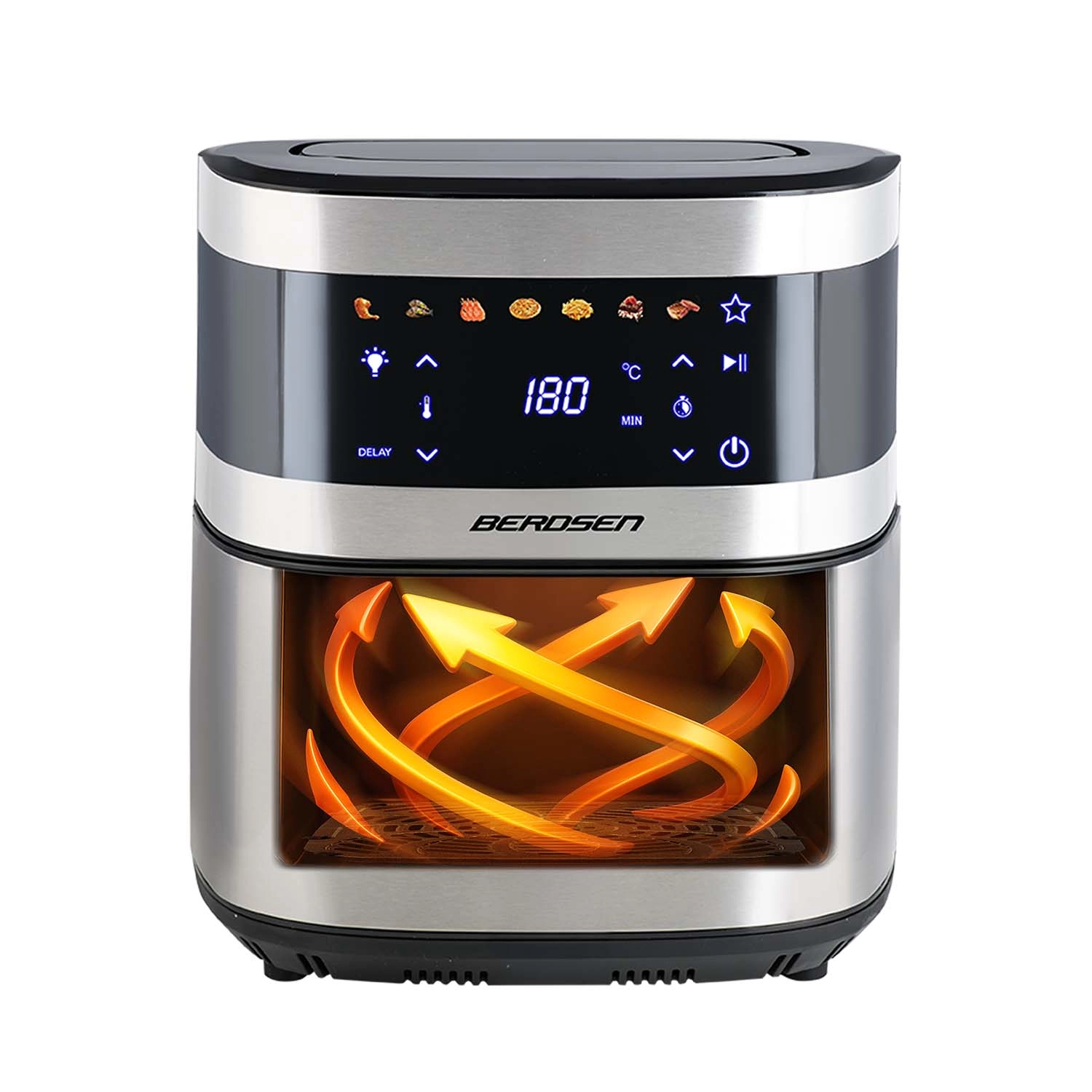 BERDSEN BD-656 združuje visoko moč 1700 W in izredno velik 9,1 l vsebnik za hitro in enakomerno pečenje, cvrtje ter žar z minimalno količino olja. Intuitivni zaslon na dotik ponuja 7 prednastavljenih programov in natančno nastavitev 40–200 °C. Zahvaljujoč okencu z LED lučjo imate potek kuhanja pod nadzorom brez prekinitev.