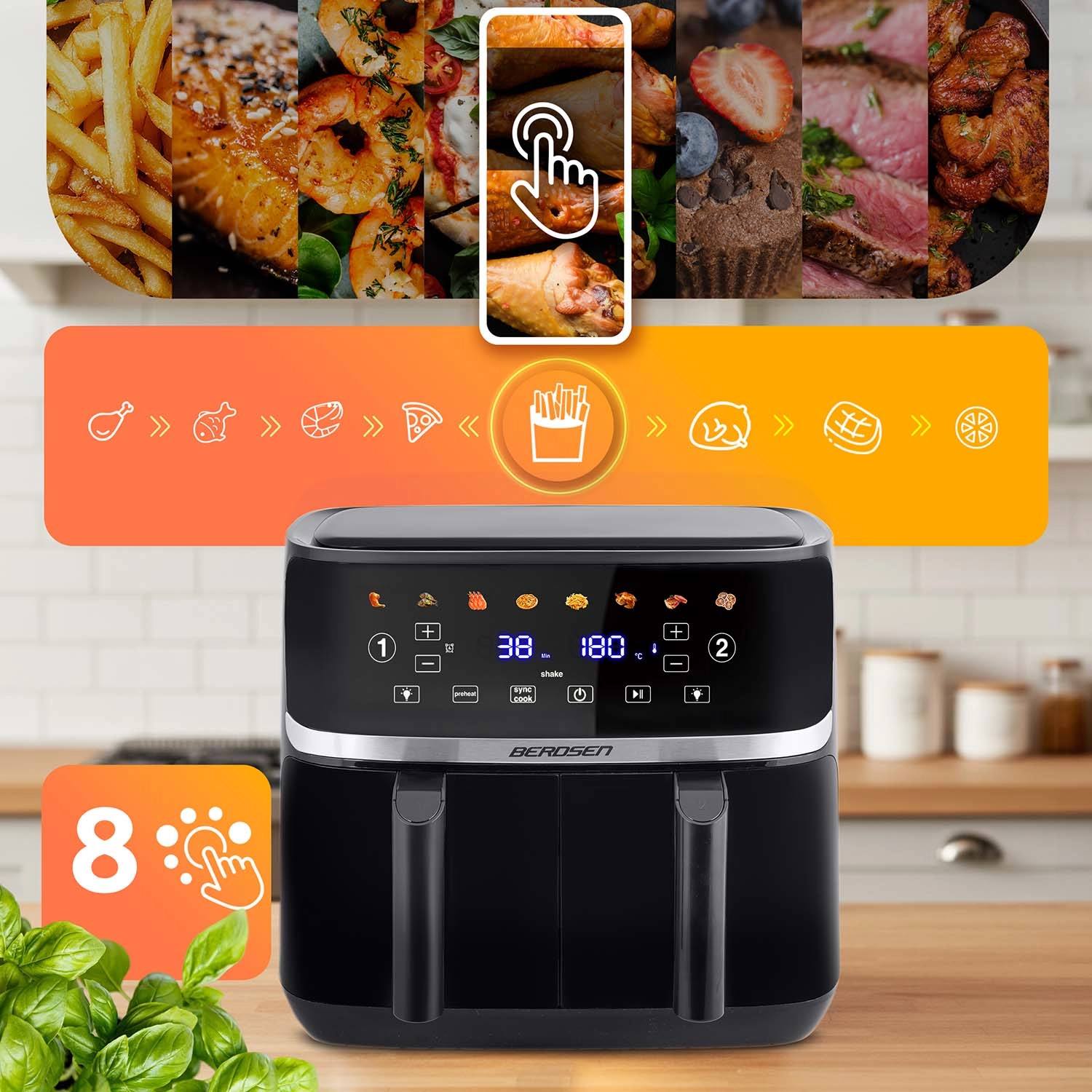 Odkrijte udobno in bolj zdravo kuhanje z zračnim cvrtnikom BERDSEN s prostornino 10,2 l in dvojno komoro (2 × 5,1 l). Zahvaljujoč moči 1700 W, 8 samodejnim programom in zaslonu na dotik pripravite hrustljav krompirček, sočno meso in zelenjavo z do 90 % manj maščobe. Praktična okenca z LED osvetlitvijo omogočajo spremljanje pečenja brez odpiranja, funkcije predgretja, zakasnjenega zagona in opozorila za obračanje pa naredijo kuhanje preprosto.