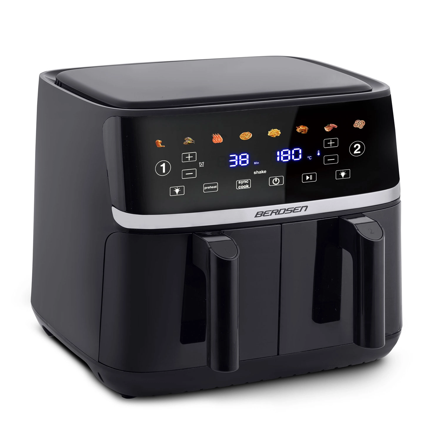 BERDSEN BD-657 združuje moč, kapaciteto in pametne funkcije v elegantni črni izvedbi. Dve neodvisni coni omogočata hkratno pripravo različnih jedi – na primer krompirčka in piščanca – s posamičnimi nastavitvami časa in temperature do 200 °C. Neprijemljiva PTFE površina in deli, primerni za pomivalni stroj, zagotavljajo enostavno čiščenje brez napora.