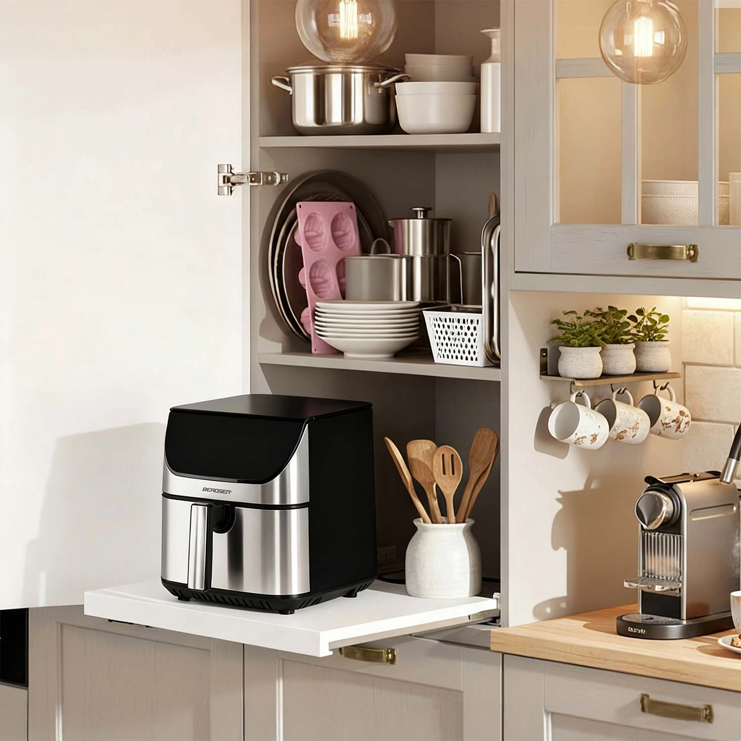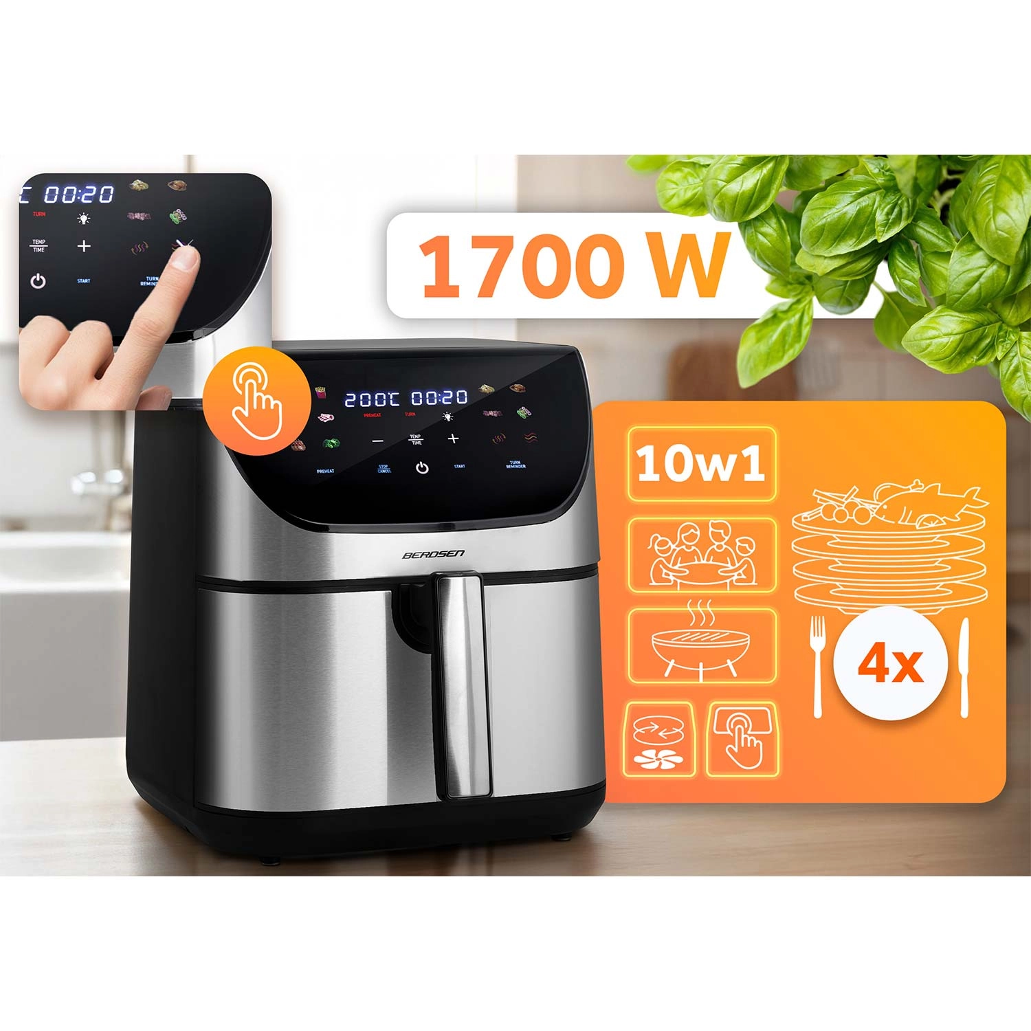 Večja kapaciteta, manj maščobe in največje udobje – cvrtnik na vroč zrak BERDSEN 8 l z močjo 1700 W pripravi hrustljav krompirček, sočno piščančje meso in pečeno zelenjavo skoraj brez olja. Ponuja 12 samodejnih programov, načrtovalnik na dotik z osvetlitvijo, nastavitev temperature do 200 °C ter opomnik za obračanje jedi. Ohišje iz nerjavečega jekla se enostavno čisti in se odlično poda vsaki kuhinji.