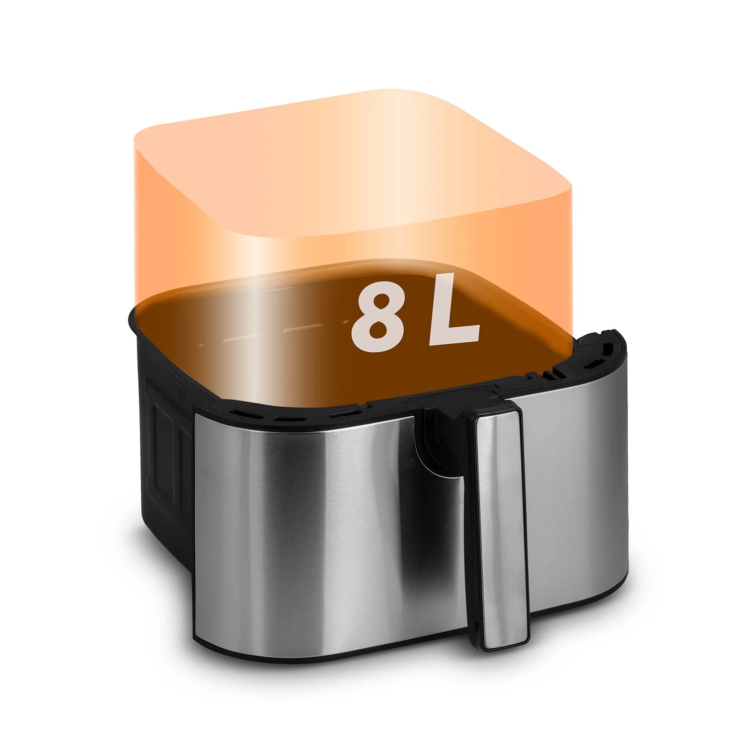 Z napredno cirkulacijo vročega zraka dobite zlato, hrustljavo skorjico zunaj in sočnost znotraj – brez vonja po olju in odvečnih kalorij. Prostornina 8 litrov zadošča za kosilo za vso družino, veliko porcijo krompirčka za prijatelje ali peko celega piščanca. Notranji deli z neprijemljivo površino PTFE so primerni za pomivalni stroj.