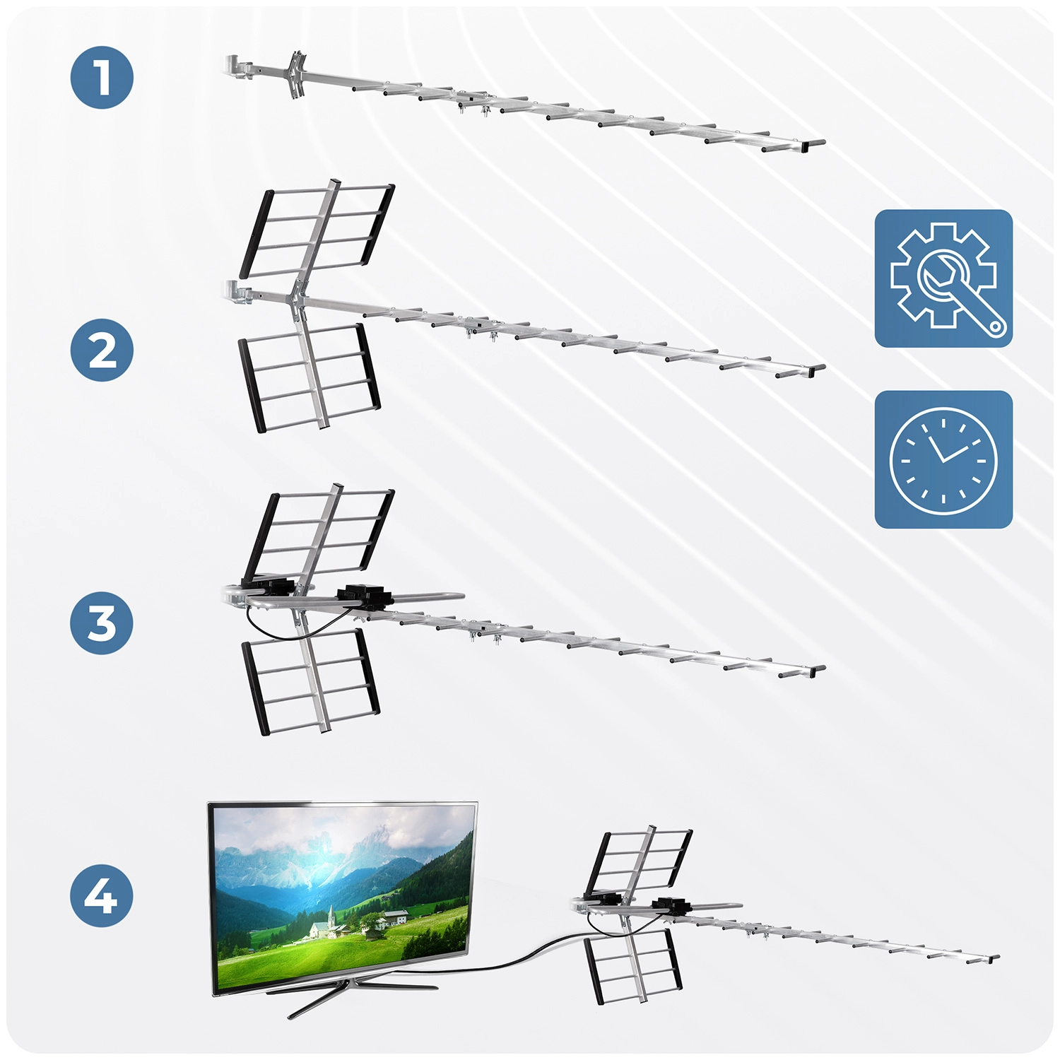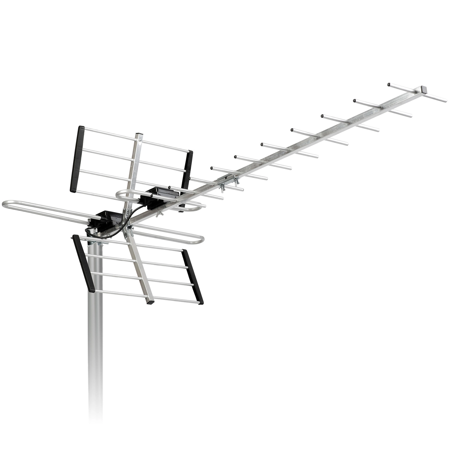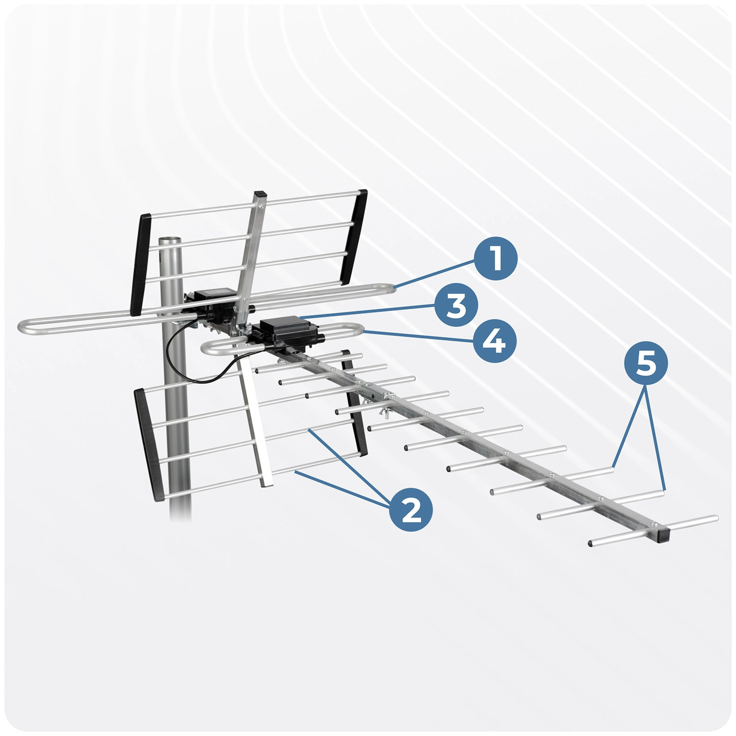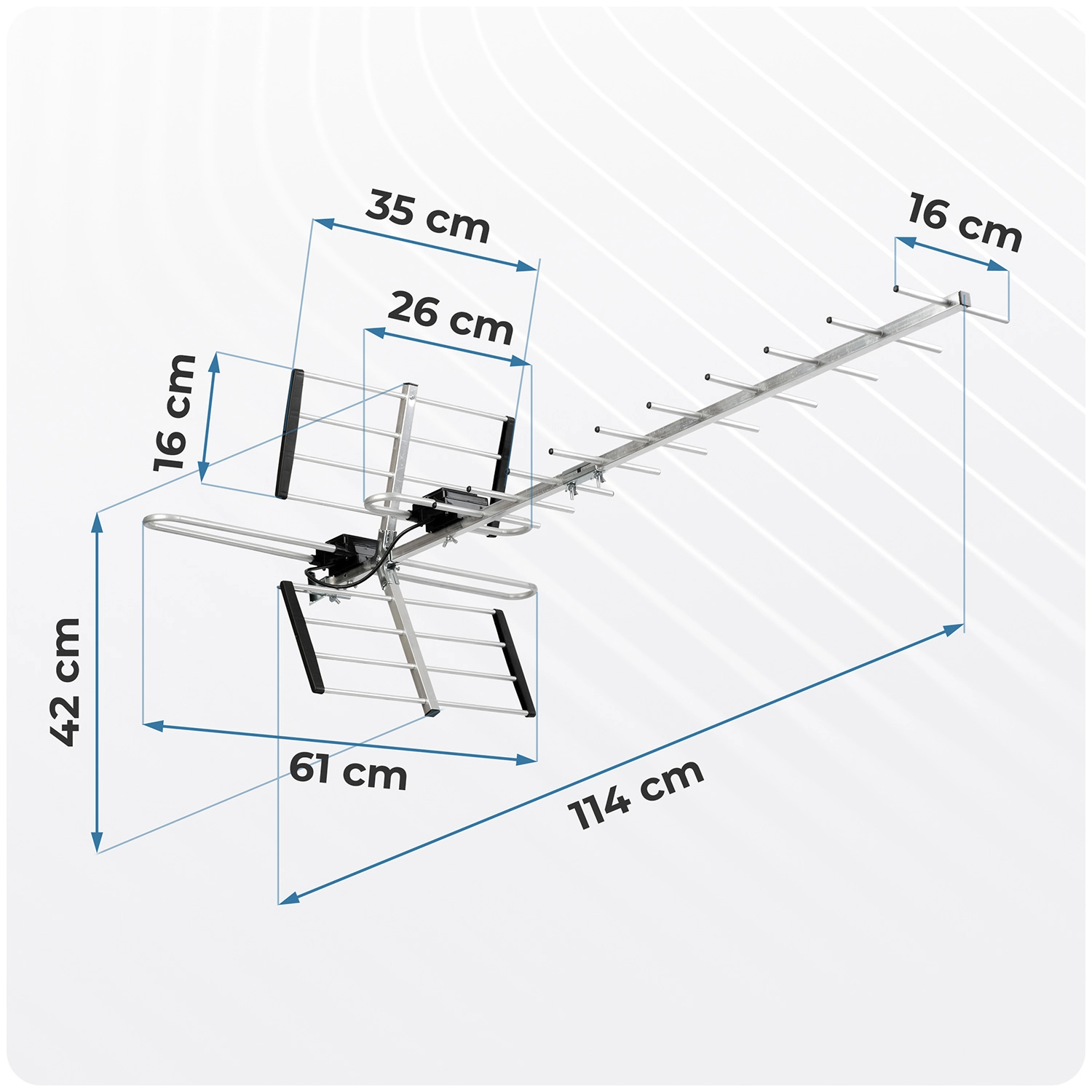 Dolga usmerjena zasnova z reflektorji in direktorji zagotavlja visoko ojačenje 15 dB in stabilen sprejem tudi na večji razdalji od oddajnika – idealno za mesto in podeželje.