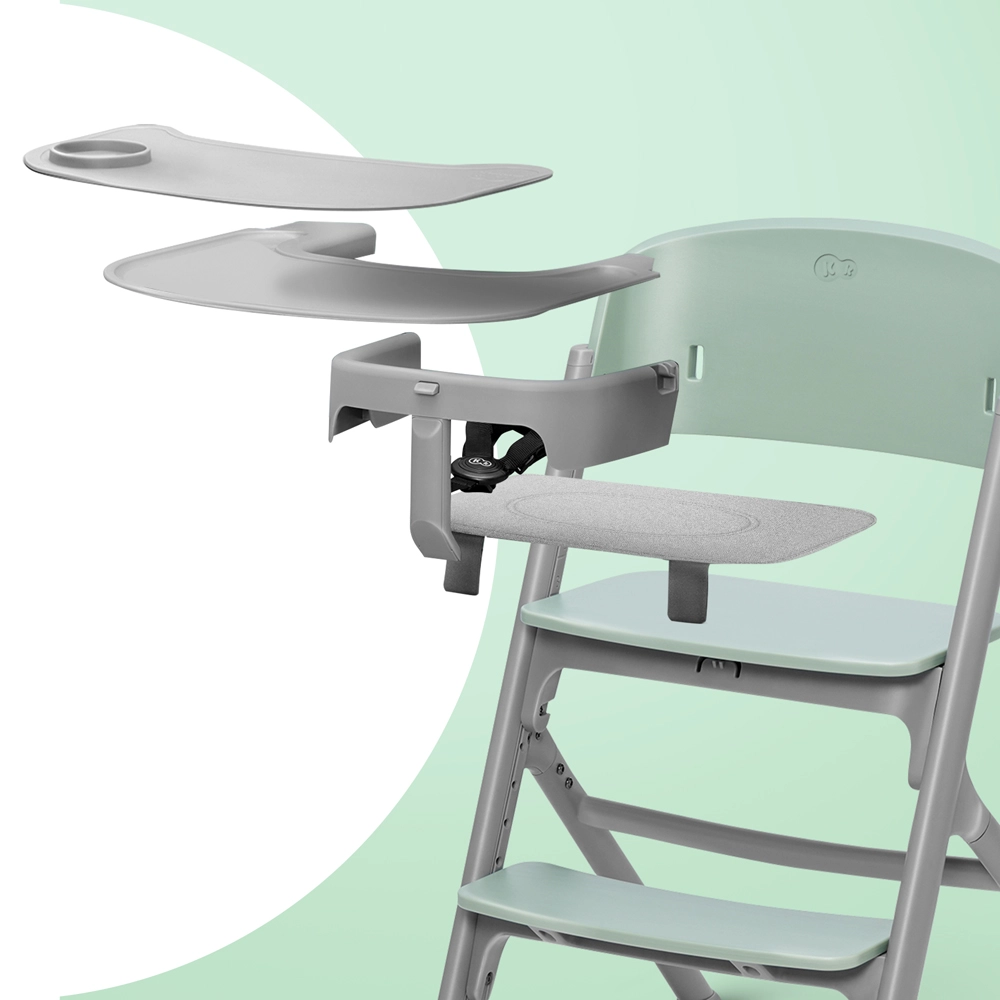 Varnost zagotavljajo 5-točkovni pasovi z nastavljivo dolžino ter čvrsta, stabilna konstrukcija iz jekla in aluminija s širokim razmakom nog. Velik, praktičen pladenj z nedrsečim silikonskim vložkom (brez BPA) je primeren za pomivalni stroj. Na stolček lahko priključite ležalnik CALMEE in tako ustvarite visok ležalnik, da imate dojenčka vedno v višini oči.