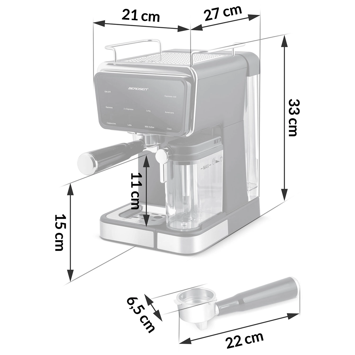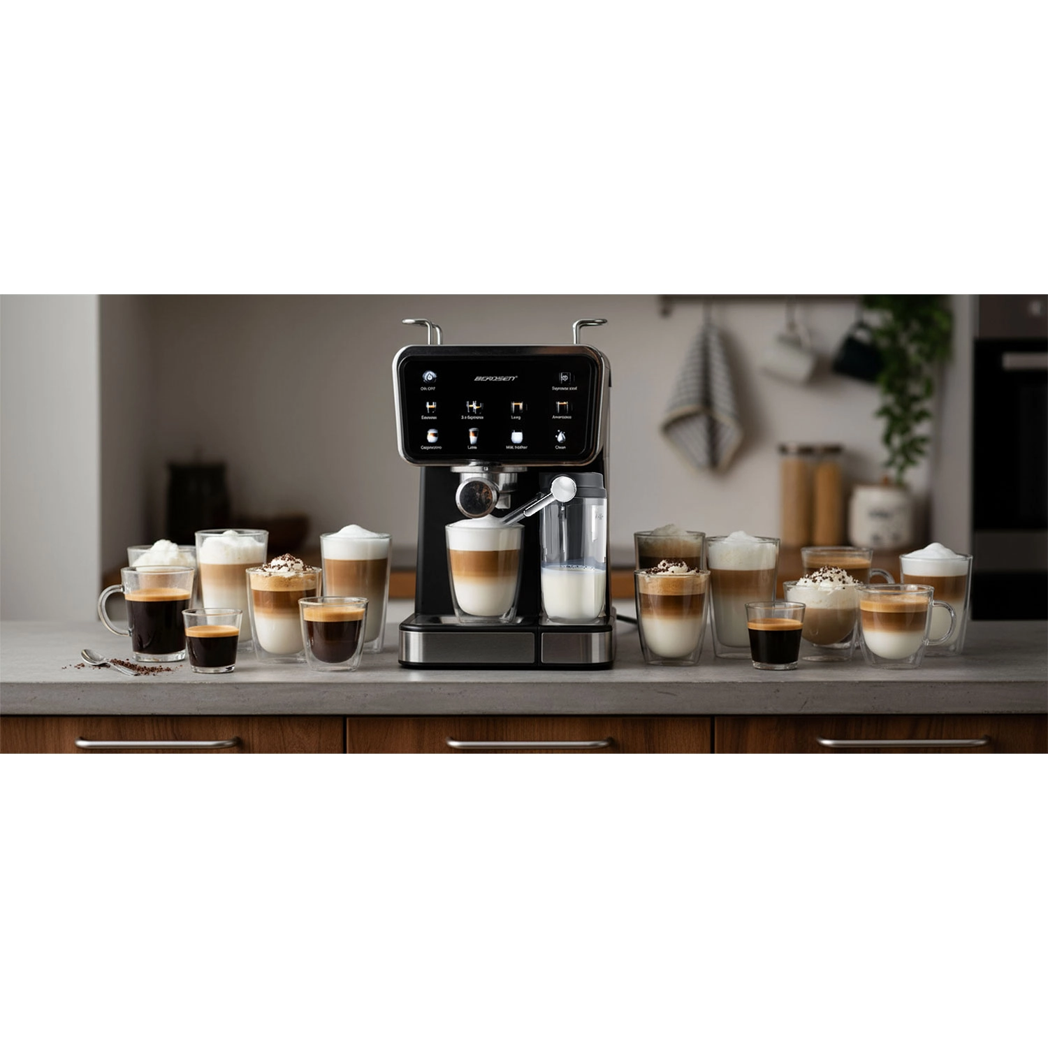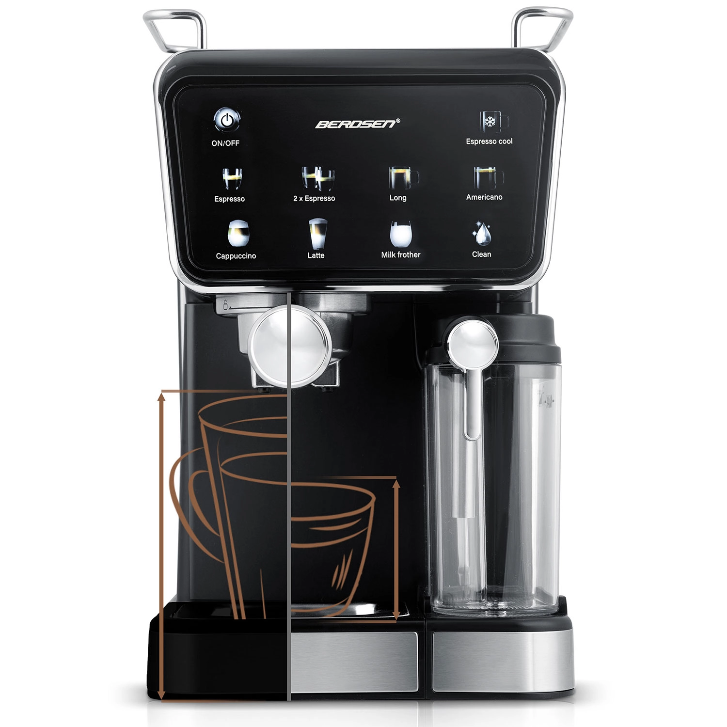 Uživajte v kavi kot iz kavarne z ročnim kavnim aparatom BERDSEN BD-773 s tlakom 20 bar, zaslonom na dotik in vgrajenim penilnikom mleka. Pripravite espresso, cappuccino, latte in americano natančno po svojem okusu, vključno s funkcijo hladnega espressa za vroče dni. Odstranljiv rezervoar za vodo 1,5 l in posoda za mleko 0,5 l, tih način delovanja ter program samodejnega čiščenja za enostavno vzdrževanje.