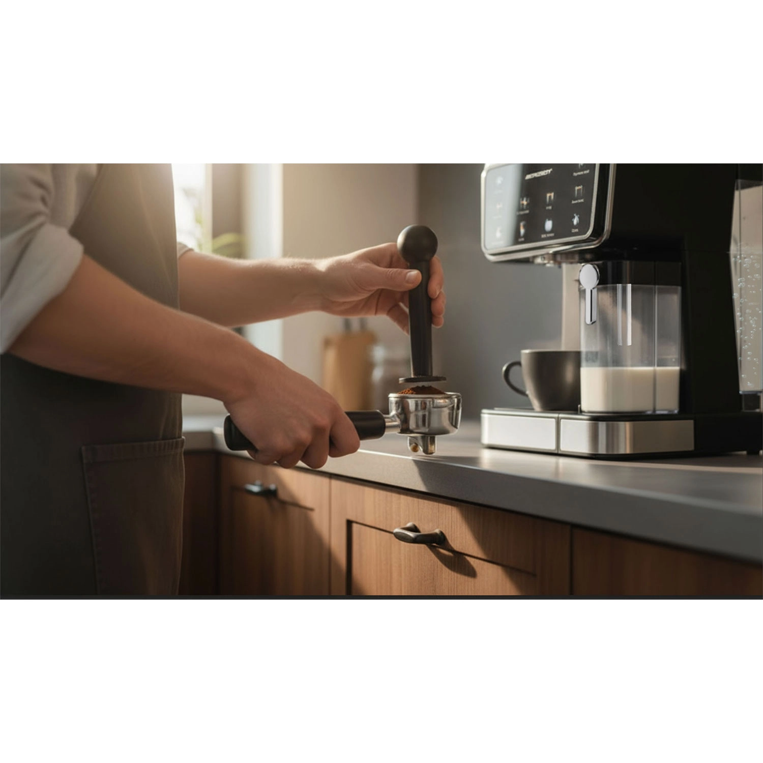 Domača kava na profesionalni ravni. Zmogljiva črpalna tehnologija s tlakom 20 bar in natančna ekstrakcija prineseta polno aromo, intenziven okus in bogato cremo. Plošča na dotik olajša izbiro napitka in nastavitve, odstranljiv penilnik z regulacijo pene pa ustvari žametno mleko za cappuccino, latte in flat white.