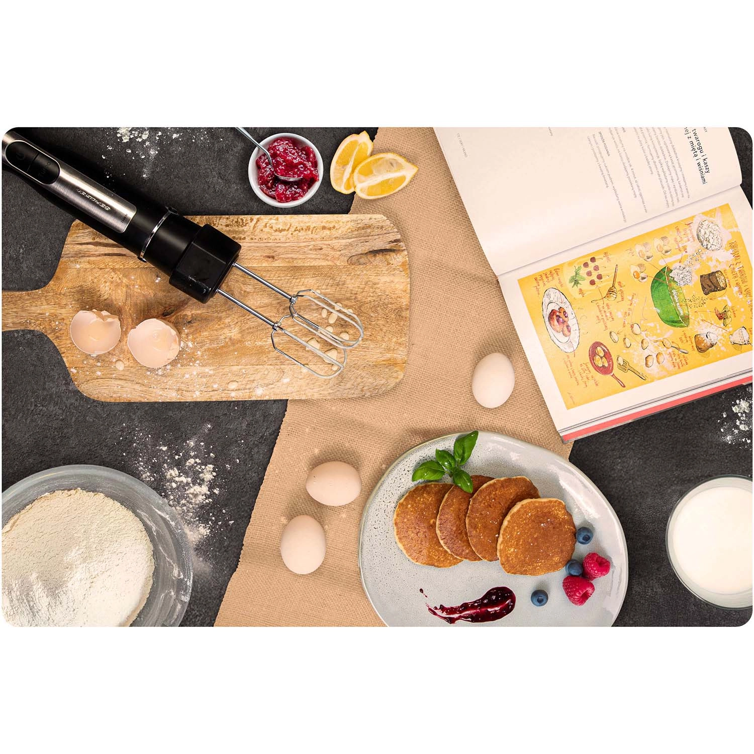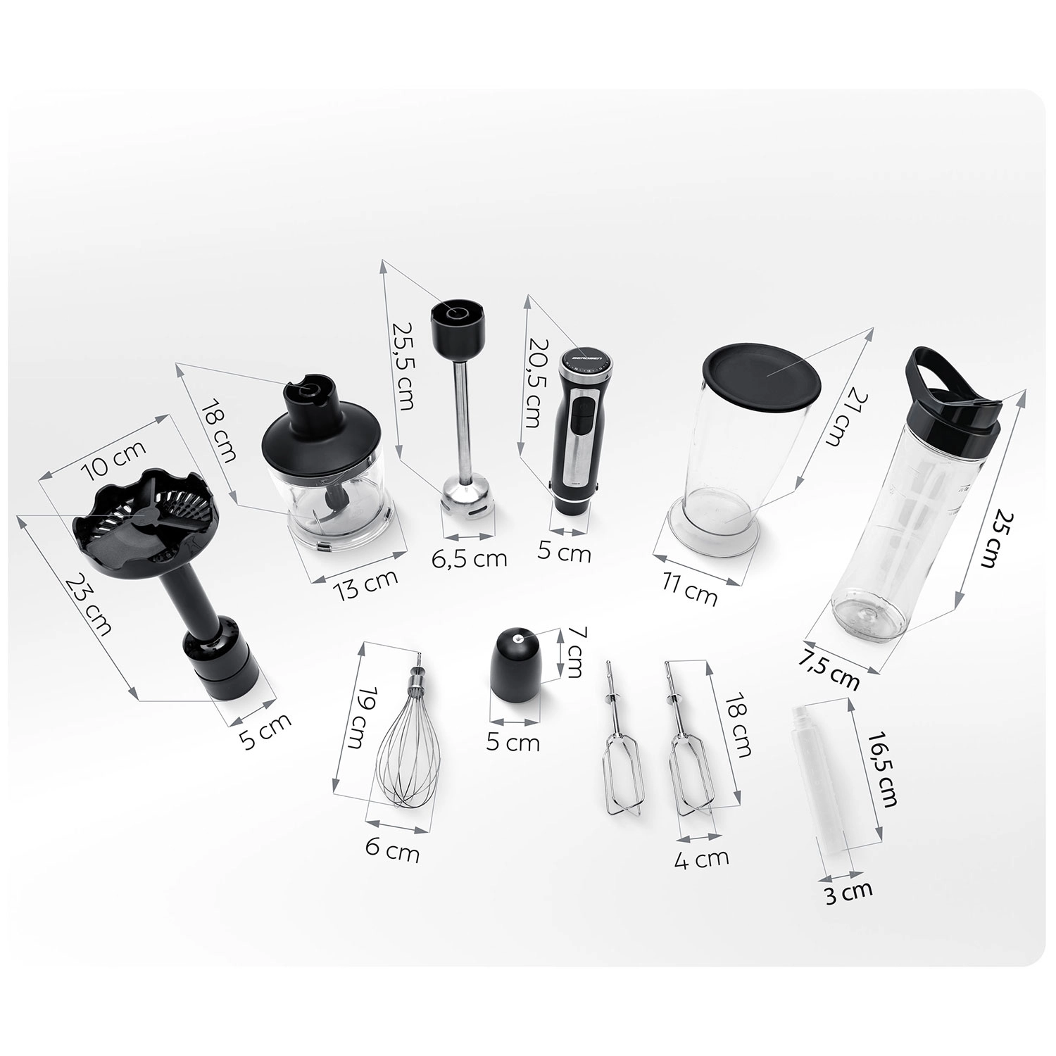 Bogata oprema pokriva kar 7 kuhinjskih funkcij: potopno mešanje, sekljanje, stepanje, gnetenje/mešanje, pripravo pirejev in smoothiejev v prenosni 600 ml steklenici (BPA free) z udobnim ustnikom in hladilnim vložkom. Varnostni elementi, kot sta zaklep proti nepravilni sestavi in zaščita pred pregrevanjem, poskrbijo za brezskrbno uporabo.