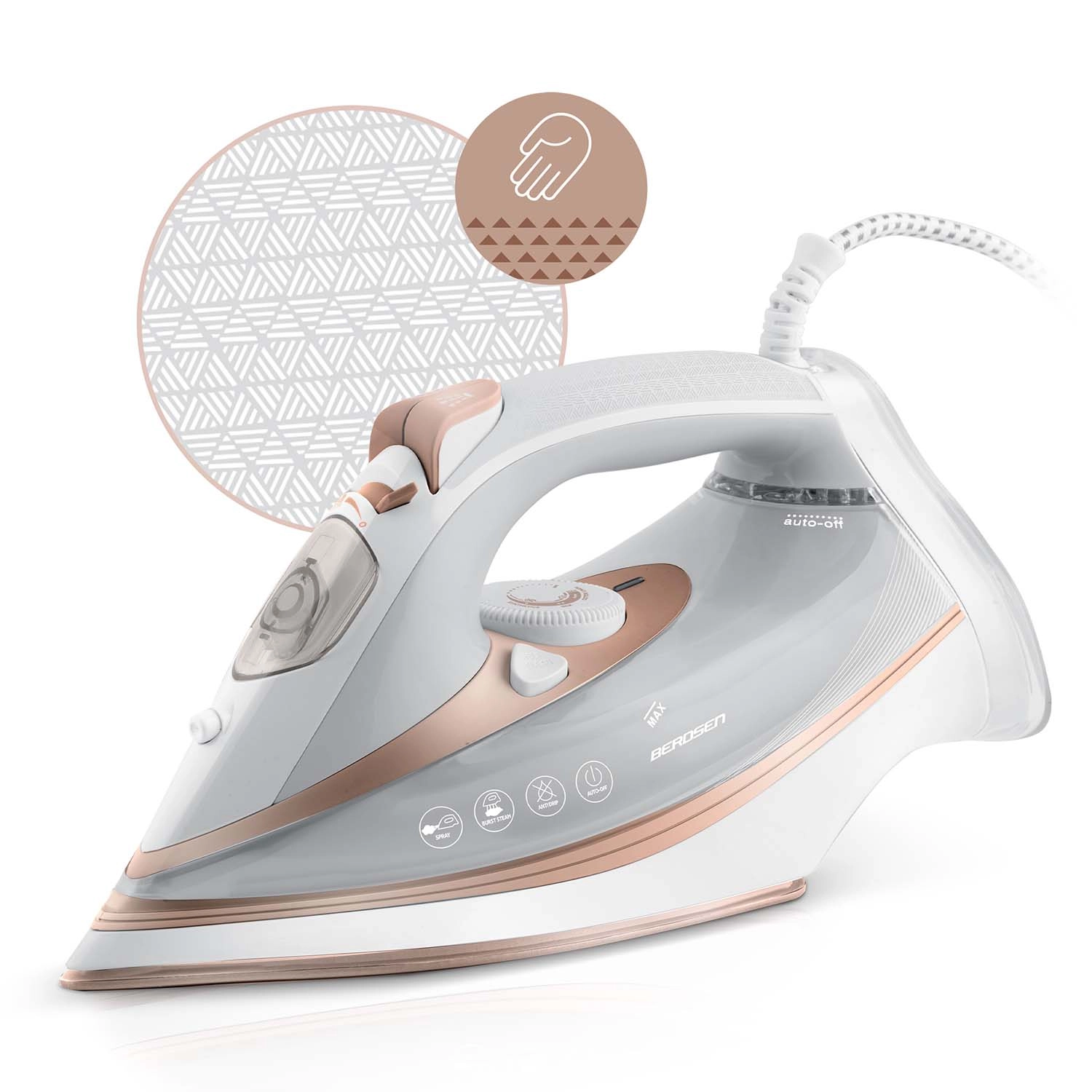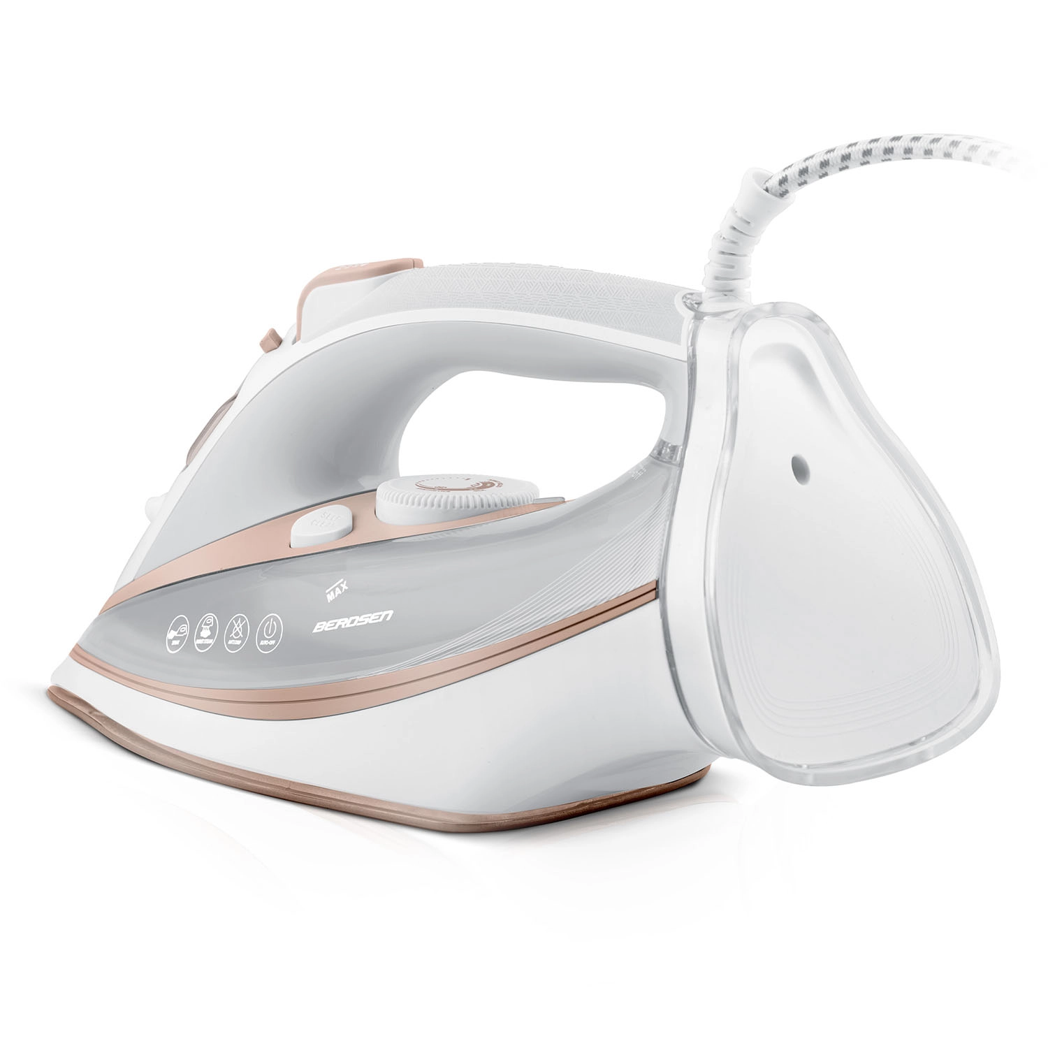 Zmogljiv parni likalnik BERDSEN z močjo 3000 W ponuja dvojni parni sunek, keramično likalno ploščo z mikrokanalčki in navpično paro za hitro in nežno likanje. Zahvaljujoč funkcijam auto‑off, zaščiti pred pregrevanjem, anti‑drip in Self Clean je vzdrževanje preprosto, uporaba pa varna. Velik rezervoar 360 ml, ergonomija in 360° vrtljiv kabel zagotavljajo udobno likanje brez prekinitev.