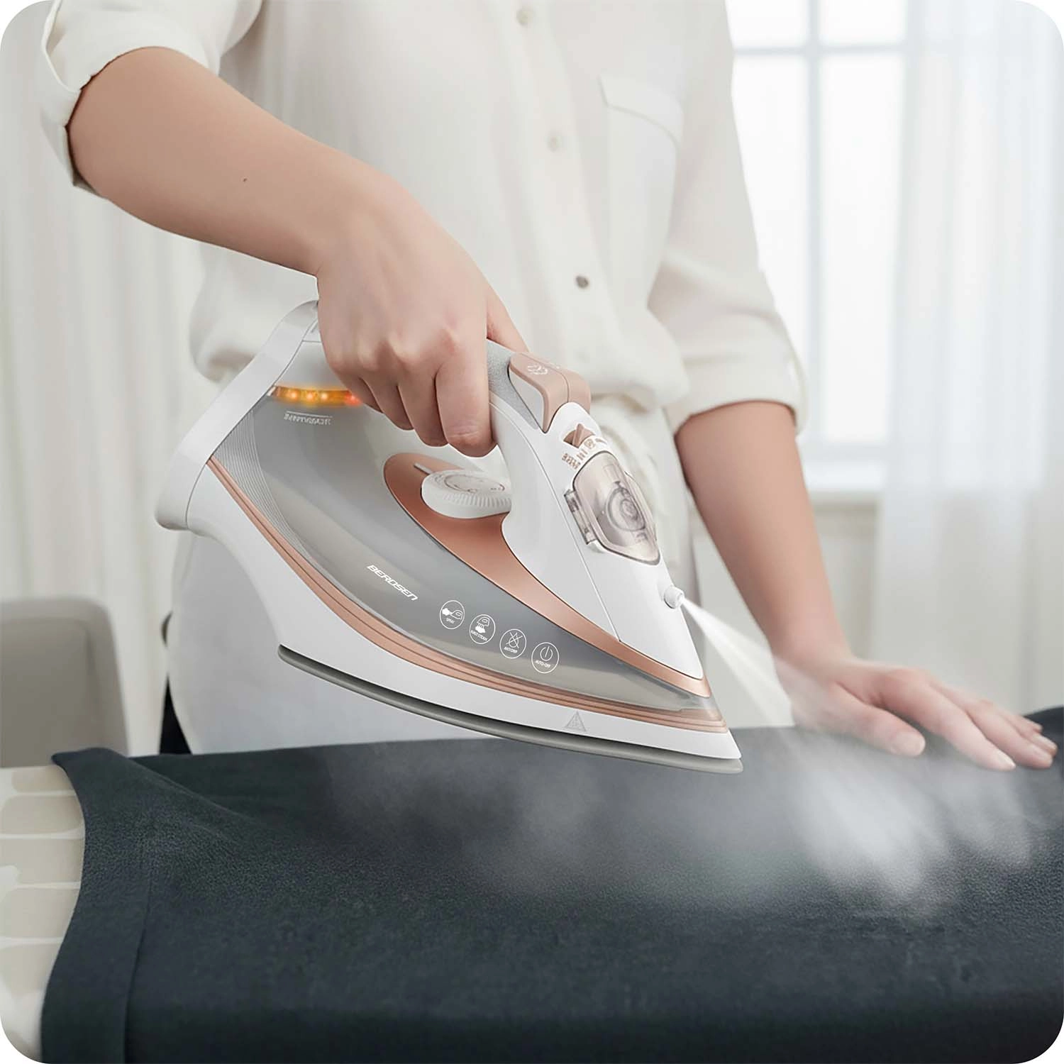 Skrajšajte čas na likalni deski s parnim likalnikom BERDSEN, ki združuje visoko moč 3000 W, hitro segrevanje in učinkovit dvojni parni sunek. Keramična likalna plošča z mikrokanalčki paro enakomerno razporeja, gladko drsi po tkanini in se zlahka spopade tudi s težavnimi mesti – okoli gumbov, ovratnikov ali manšet.
