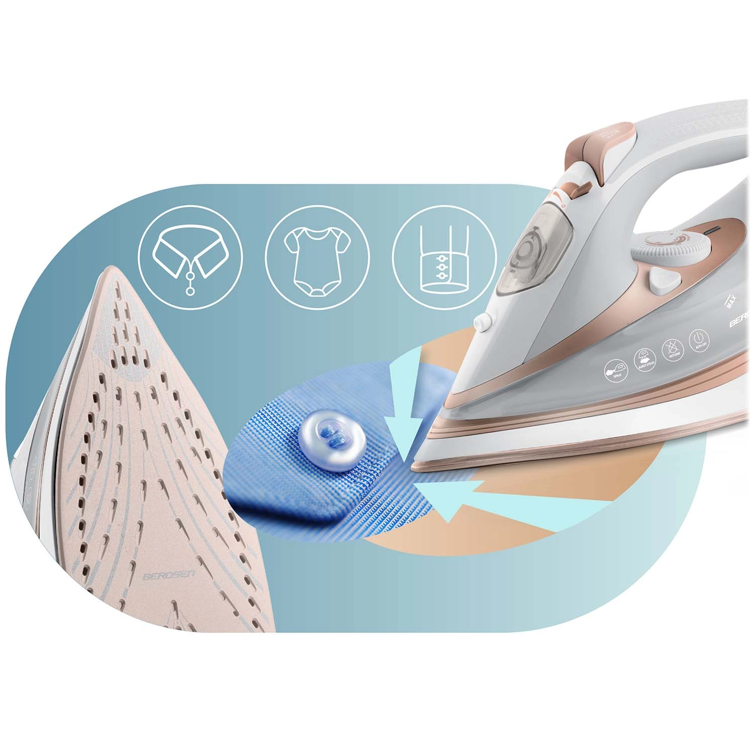 Vzdržljiva keramika zagotavlja odličen drs in enakomerno porazdelitev toplote ter pare. Zlahka doseže med gumbi in okoli ovratnikov.
