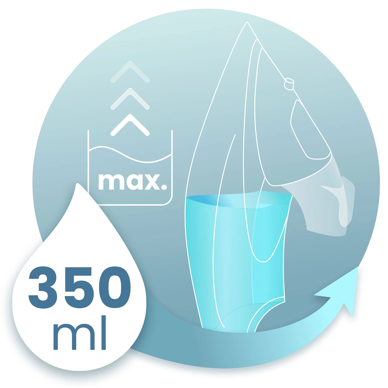 Praktične funkcije, kot so samodejni izklop, Self Clean (samočiščenje), razpršilo za trdovratne gube ter 360° vrtljiv kabel, povečujejo udobje in življenjsko dobo naprave. Velik 350 ml rezervoar zmanjšuje potrebo po pogostem dolivanju vode, prozorna stena pa omogoča enostaven nadzor nivoja.