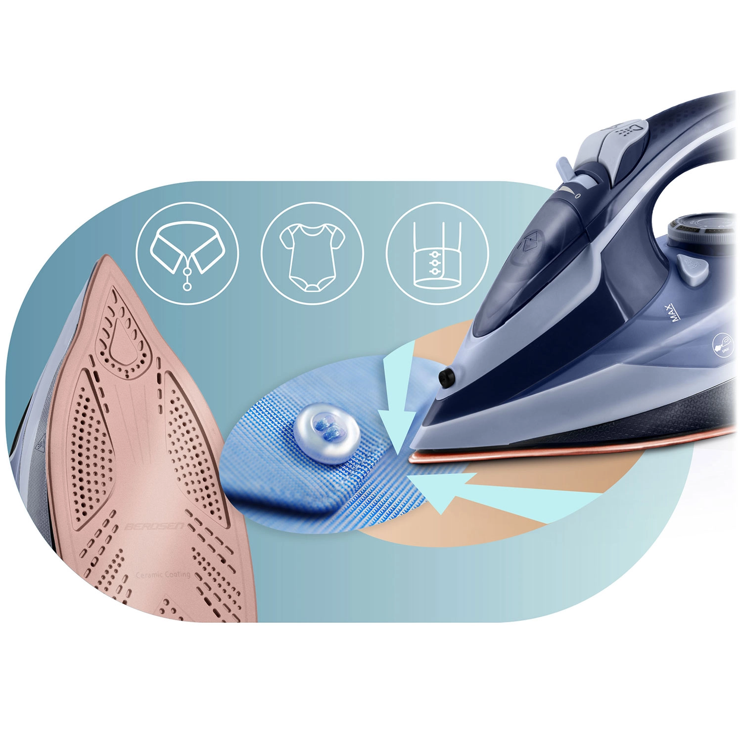 - Keramična likalna ploskev z odporno površinsko obdelavo – gladko drsenje, zaščita tkanin in natančna konica za območja okoli gumbov in ovratnikov.