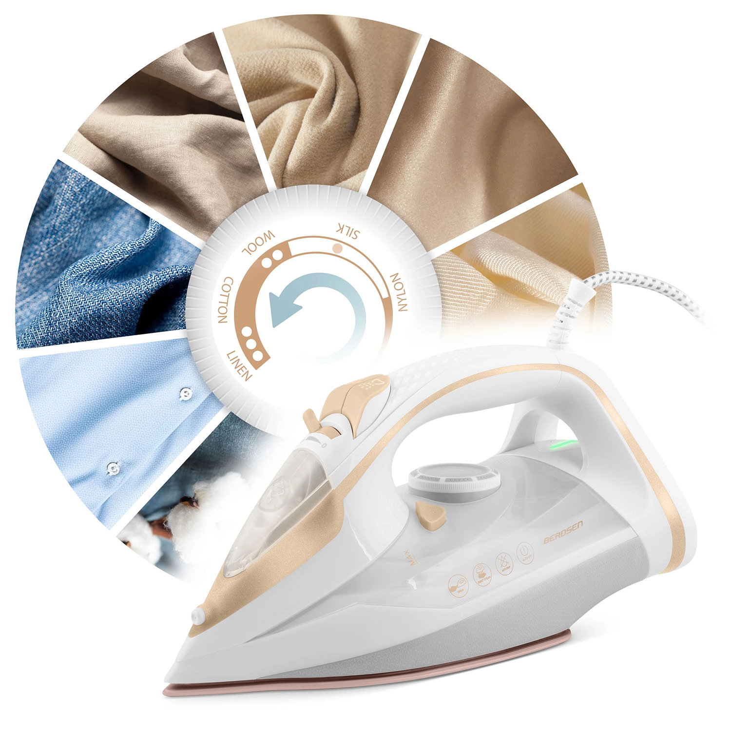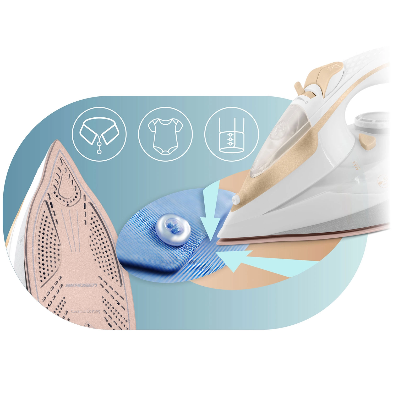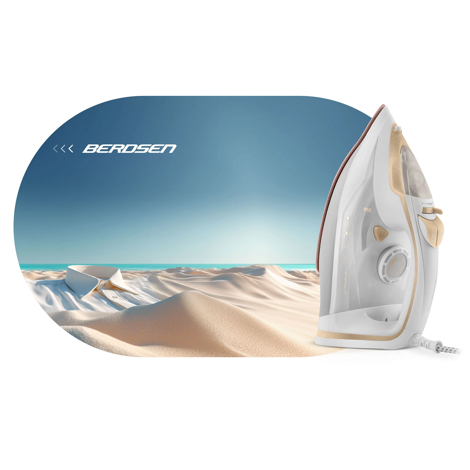 Zmogljiv parni likalnik Berdsen z močjo 3000 W zagotavlja hitro in natančno likanje vseh vrst tkanin. Ponuja keramično likalno ploščo z mikrokanački za enakomerno porazdelitev pare, navpično parjenje, stopenjsko uravnavanje temperature in pare, samodejni izklop ter praktično funkcijo Self Clean za enostavno vzdrževanje. Velik rezervoar za vodo 350 ml in vrtljiv kabel 360° povečujeta udobje uporabe.
