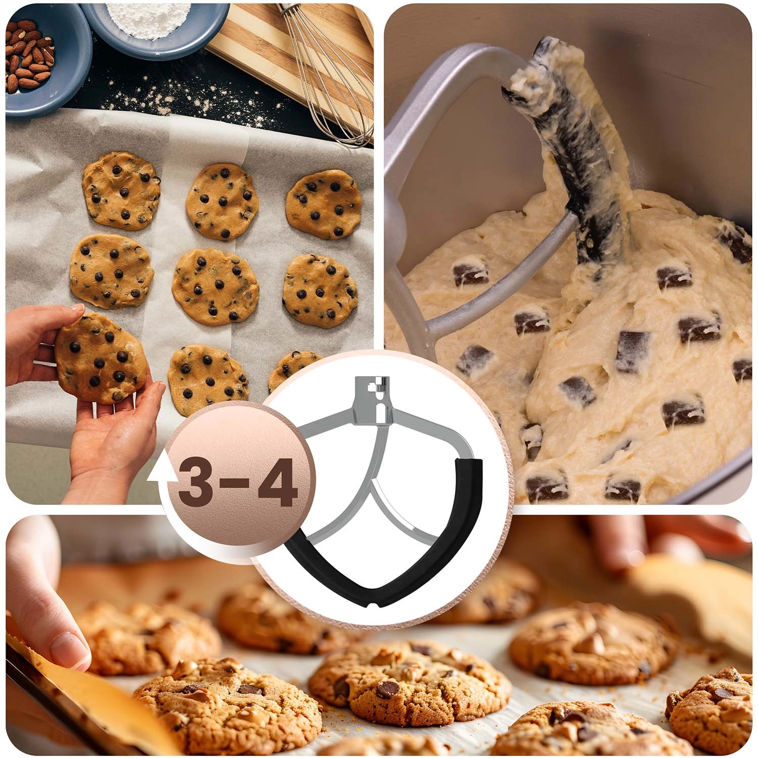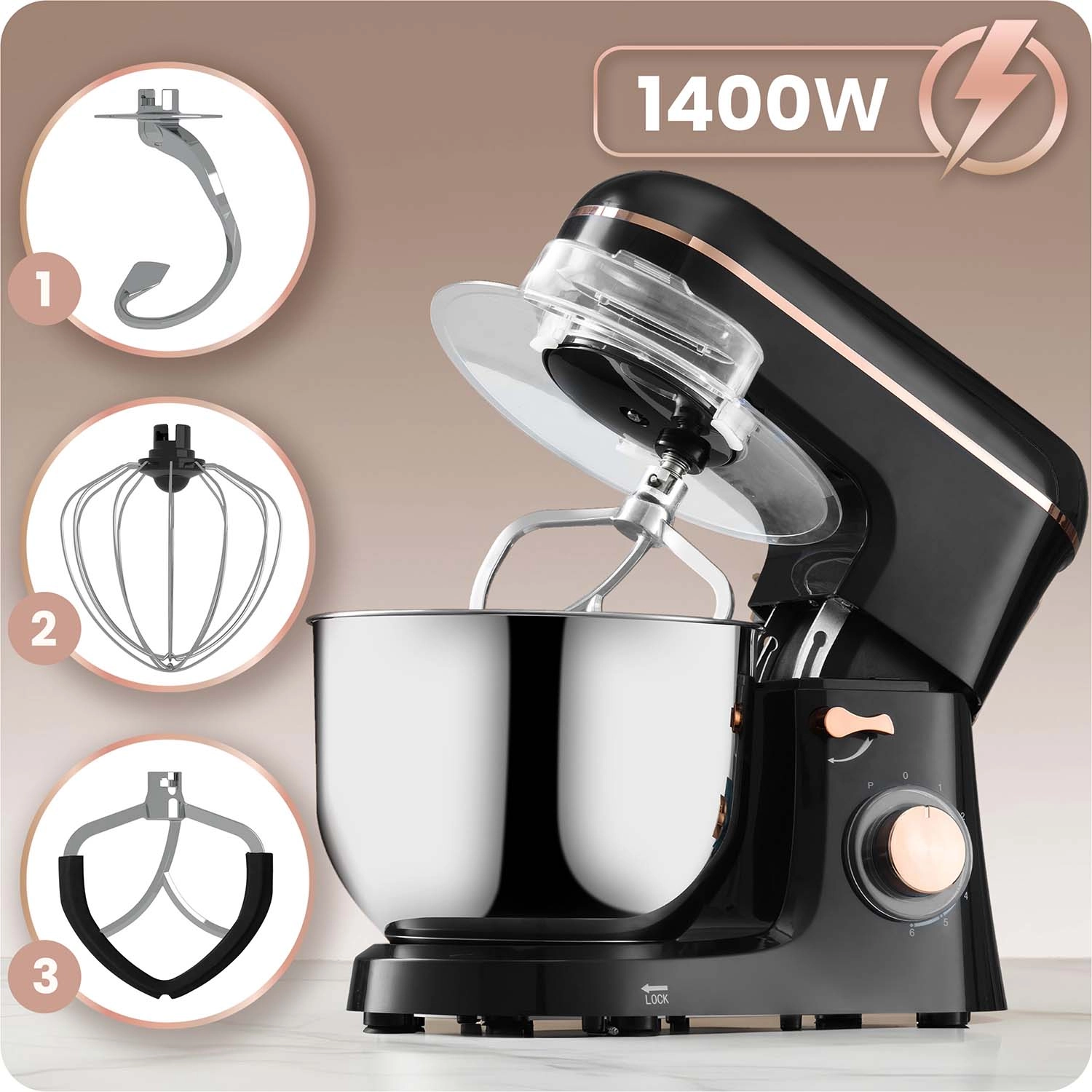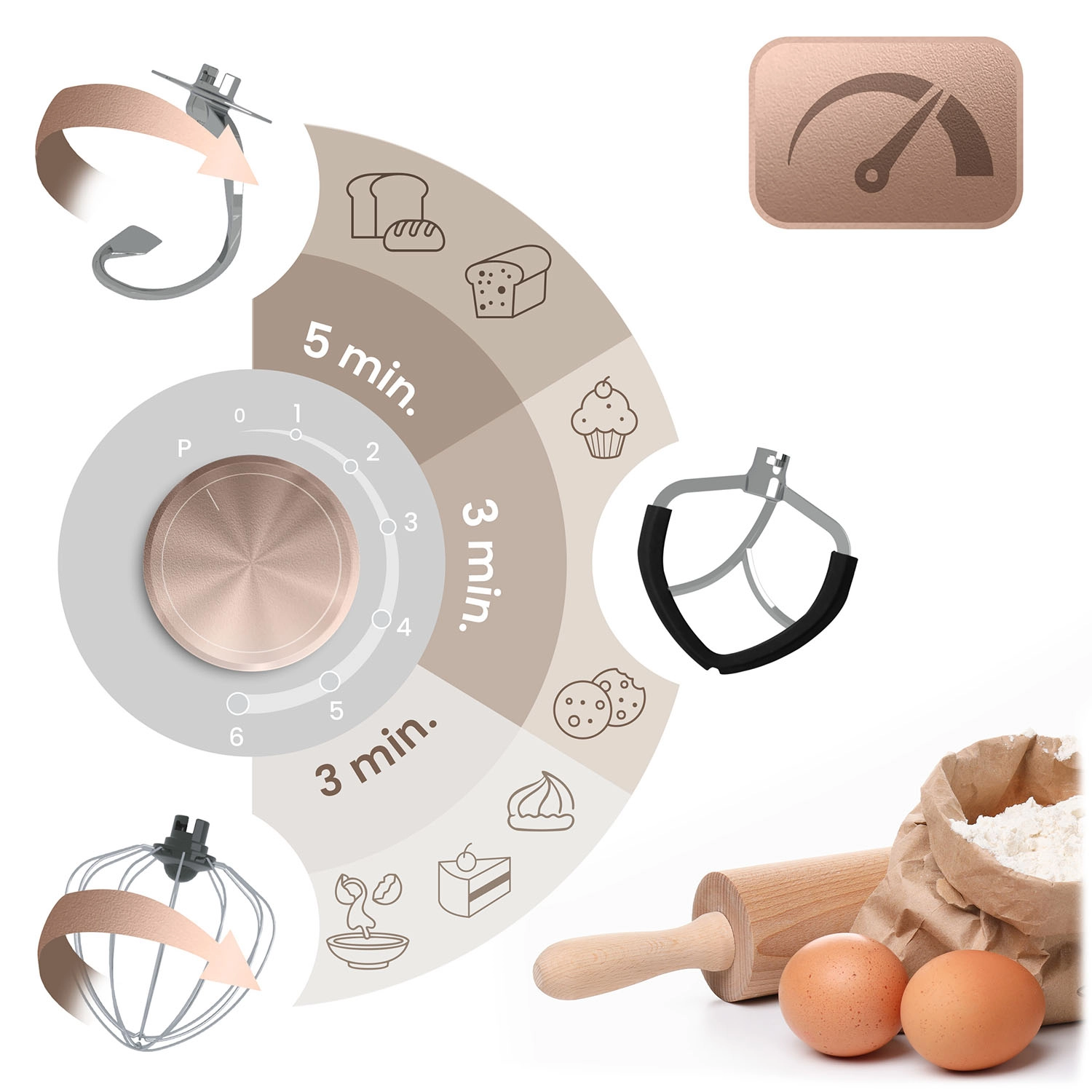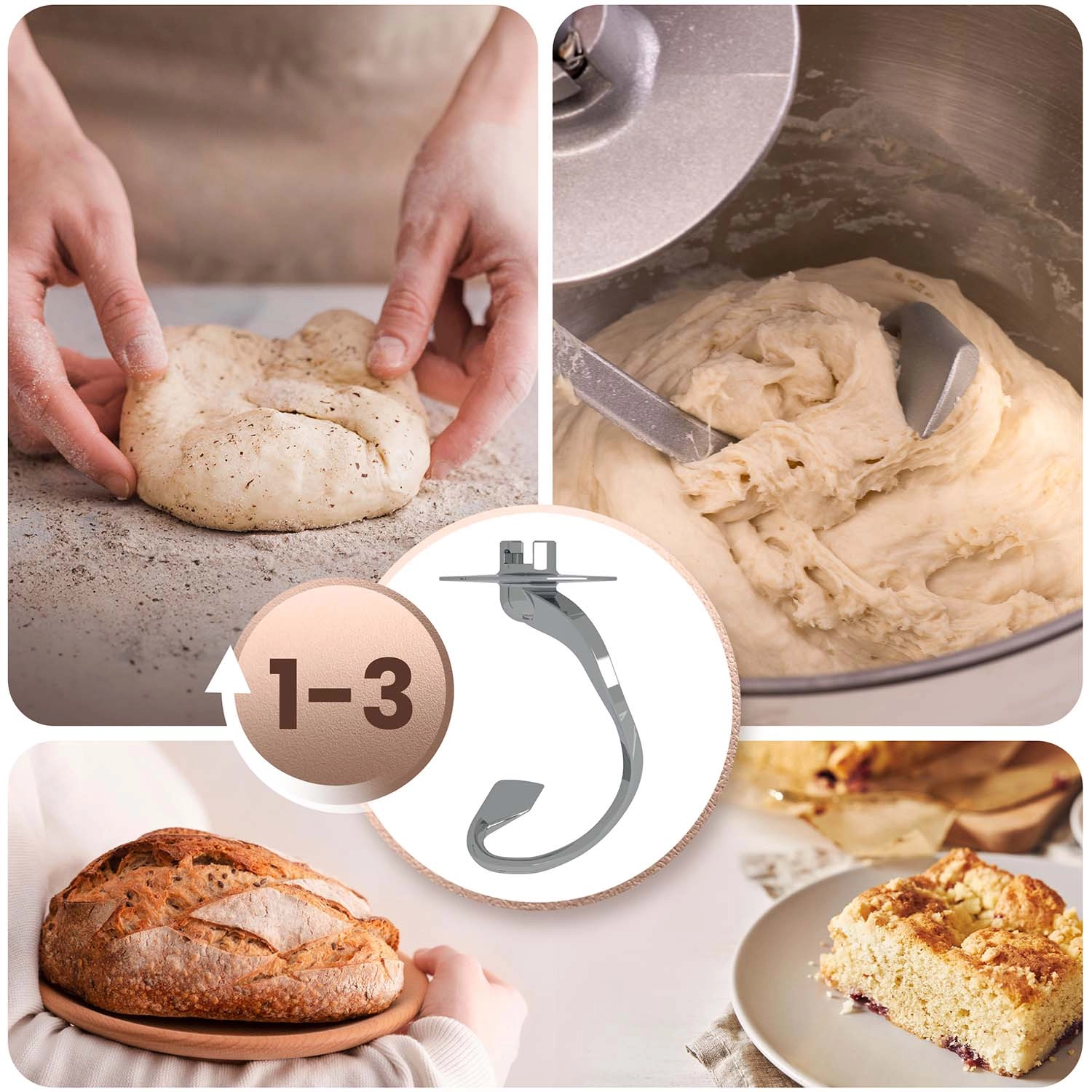 Komplet vključuje kavelj za testo (hitrosti 1–3), plosko mešalo (2–4) in metlico za stepanje (5–6) za popolno konsistenco pri vsakem receptu.