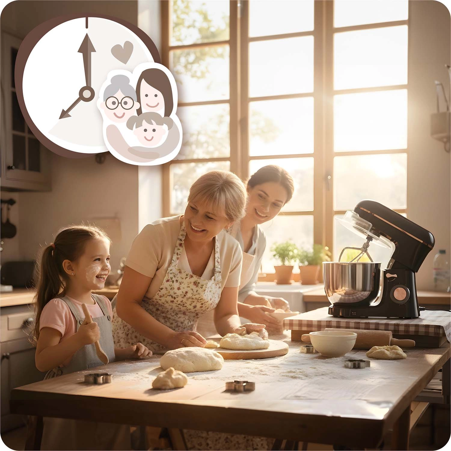 Z 6 stopnjami hitrosti in načinom PULSE preprosto prilagodite moč posameznim sestavinam: kavelj zmore krušno testo, plosko mešalo je idealno za kreme in mase, metlica pa stepe beljake ali smetano v popolno peno. Ergonomska nagibna glava, nedrseče nogice in varnostne blokade povečajo udobje in varnost uporabe.