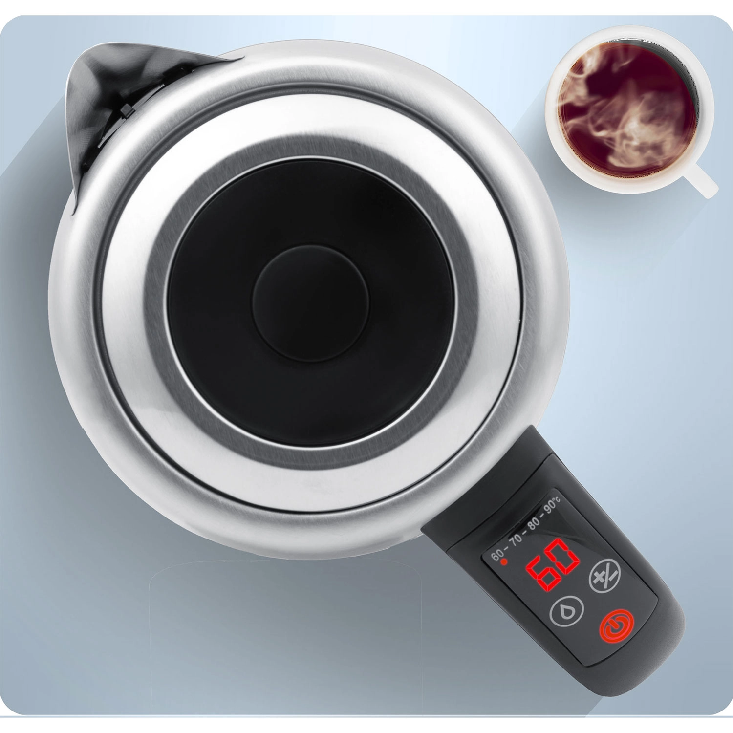 Nastavite 60/70/80/90/100 °C ali fino prilagajajte po 5 °C s pomočjo gumbov +/− na ročaju. Idealno za zeleni čaj, kavo in napitke za otroke.