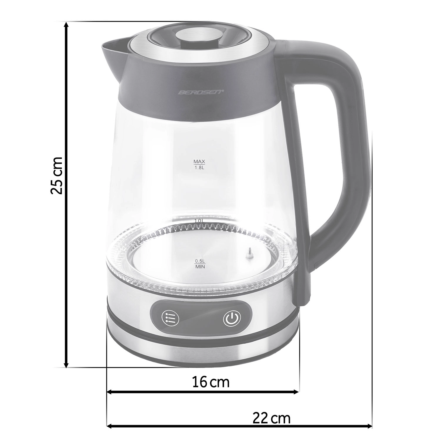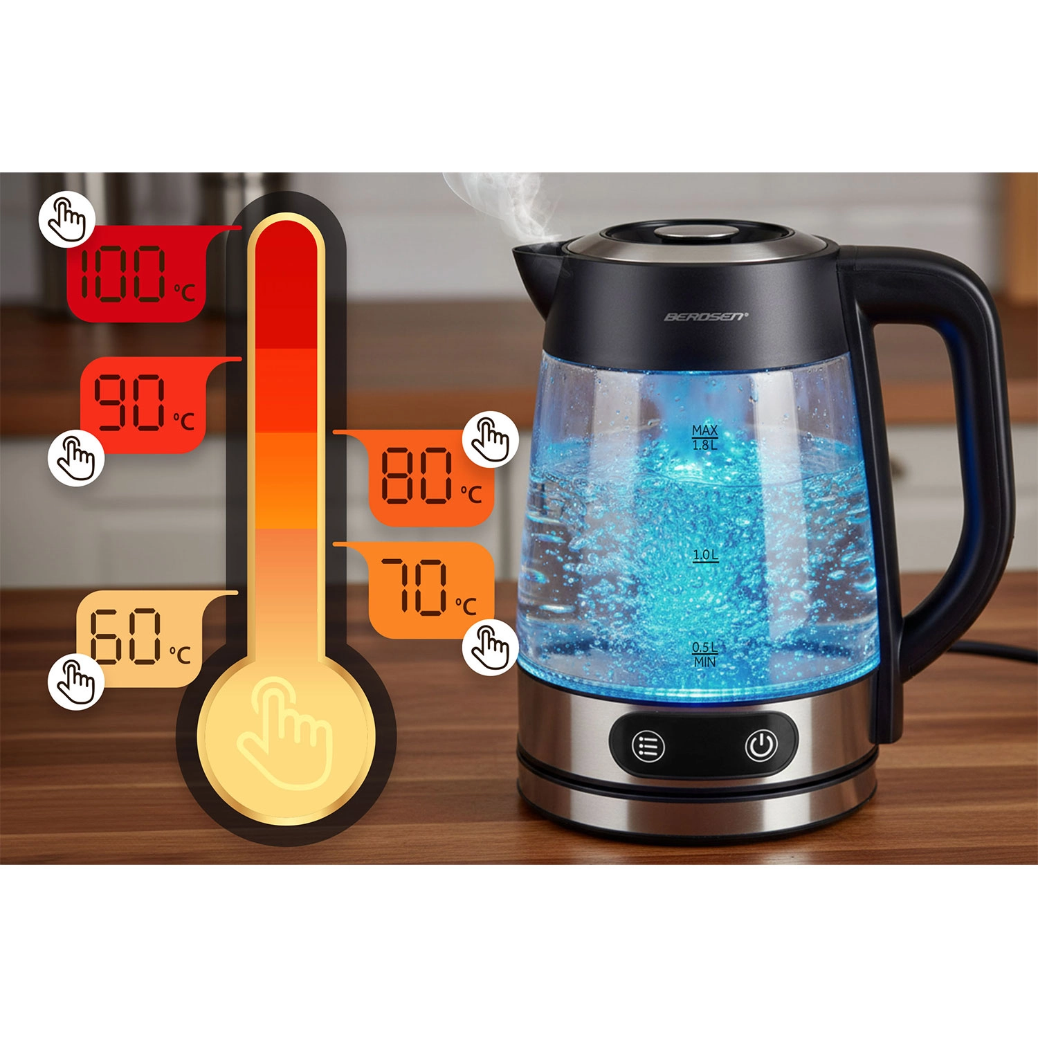 Elegantni stekleni grelnik vode BERDSEN s prostornino 1,8 l in močjo 2200 W zagotavlja natančno segrevanje vode z nastavitvijo temperature od 40 do 100 °C. Zahvaljujoč na dotik upravljanju, digitalnemu zaslonu in LED osvetlitvi je uporaba izjemno udobna. Odporno borosilikatno steklo zagotavlja dolgo življenjsko dobo in čistost vode, funkcija Keep Warm ohranja temperaturo, varnostna zaščita pred delovanjem na suho pa zagotavlja mir pri vsakodnevni uporabi.