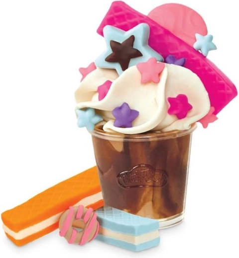 Z enostavnim pritiskom na ročico napolnite lonček z “mehkim sladoledom” ali barvitim napitkom ter ga okrasite s prelivi in oblikami iz modelčkov. Idealno za igro barista in razvoj domišljije.