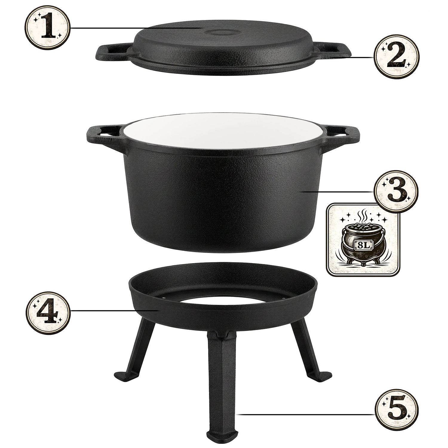 Del kompleta je trinožnik s stabilnimi nožicami in enostavno pritrditvijo ohišja s tremi vijaki za varnost nad plamenom tudi na neravni podlagi. Obojestranski pokrov/posoda razširi možnosti priprave – od hrustljavega pečenja do pokrivanja jedi za počasno kuhanje. Praktični stranski ročaji olajšajo rokovanje in serviranje.