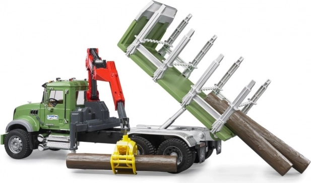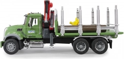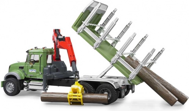 Robusten model tovornega vozila BRUDER MACK GRANITE je idealen za realistično igro sečnje in prevoza lesa. Prosojna vetrobranska šipa iz nelomljivega polikarbonata, odpirajoča se kabina in pokrov motorja z vpogledom na motor dajejo modelu avtentičen videz. Stabilnost pri nakladanju zagotavljajo izvlečne oporne noge, vrtljivi žerjav s prijemalom pa je enostaven za upravljanje.