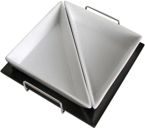 Stilski postrežni set dveh keramičnih trikotnih skledic na lesenem pladnju je idealen za pomake, oreščke, olive ali omake. Nerjaveči ročaji olajšajo prenašanje, skledice pa so primerne za pomivalni stroj. Pladenj preprosto obrišite z vlažno krpo.
