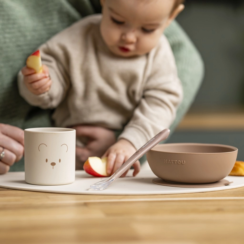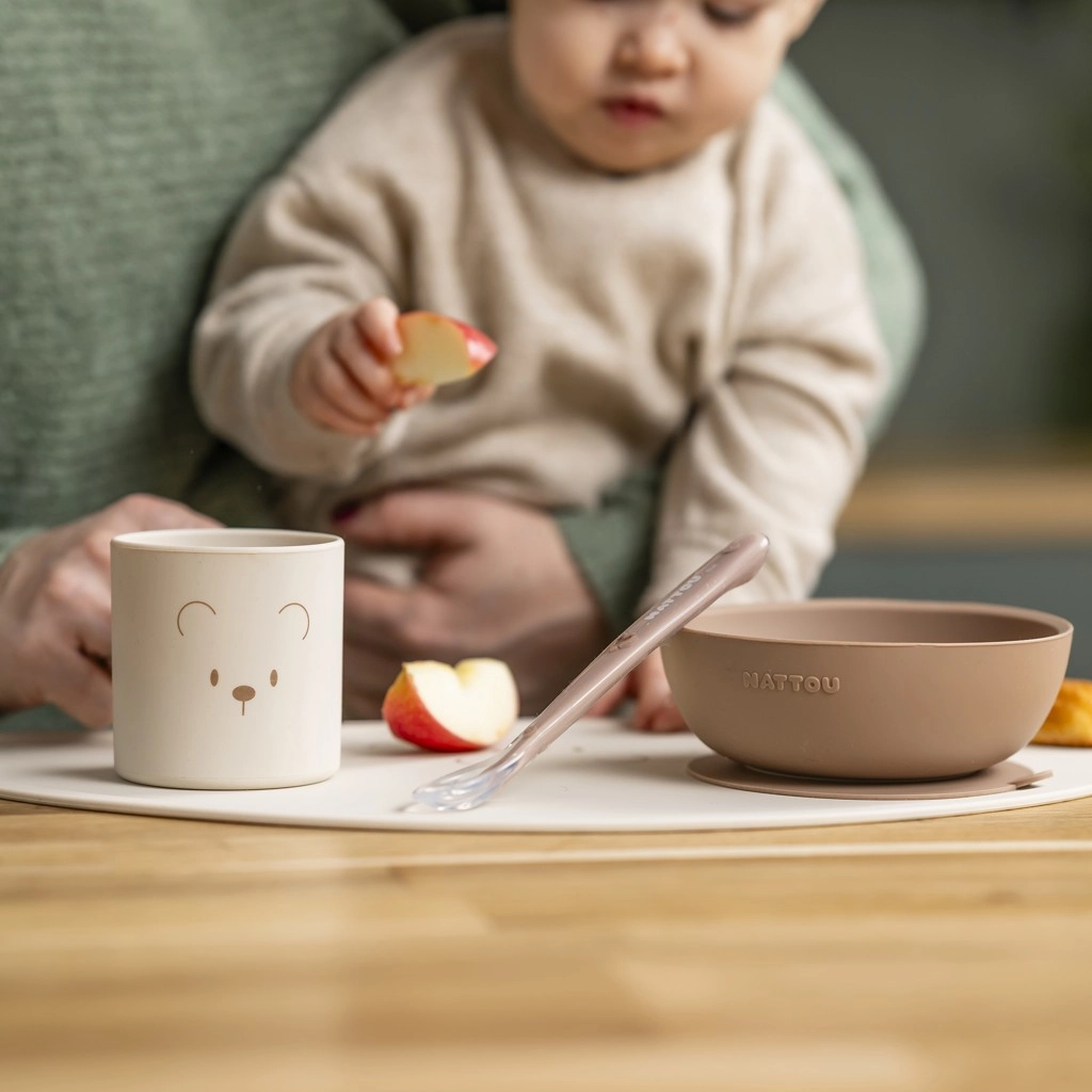 Ta silikonski jedilni set Nattou je zasnovan tako, da podpira prve otrokove korake k samostojnemu prehranjevanju. Mehak in vzdržljiv silikon je prijeten na dotik, varen za otroške dlesni in hkrati vzdrži vsakodnevno uporabo brez pokanja ali lomljenja. Nevtralni odtenek natural se zlahka ujema z modernim interierjem.