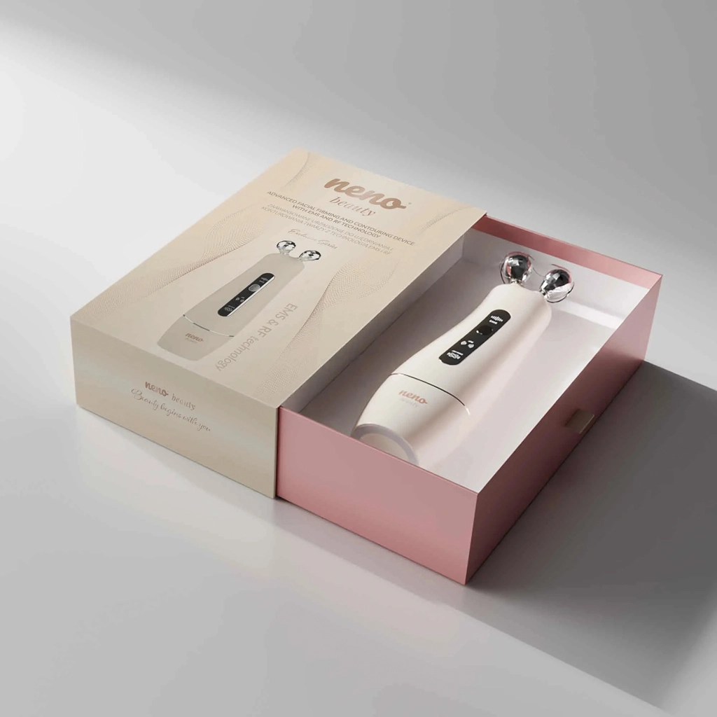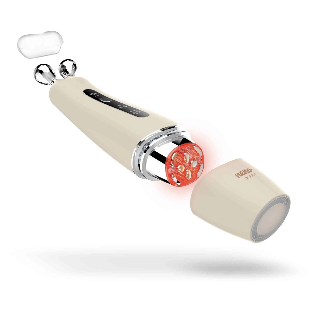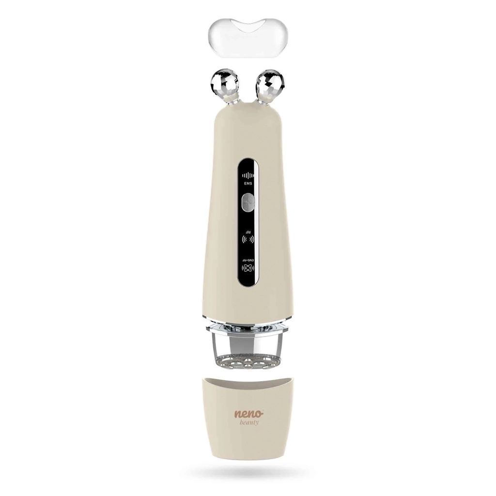 Neno Beauty Algo je večnamenska kozmetična naprava za domačo uporabo, ki pomaga definirati konture, spodbuditi tvorbo kolagena in izboljšati elastičnost kože. Združuje napredni tehnologiji EMS in RF z LED terapijo ter soničnimi vibracijami za ciljan, a nežen tretma. Z dvema zamenljivima glavama – diamantno in ploščato z osmimi masažnimi točkami – enostavno prilagodite nego tipu in trenutnim potrebam kože.