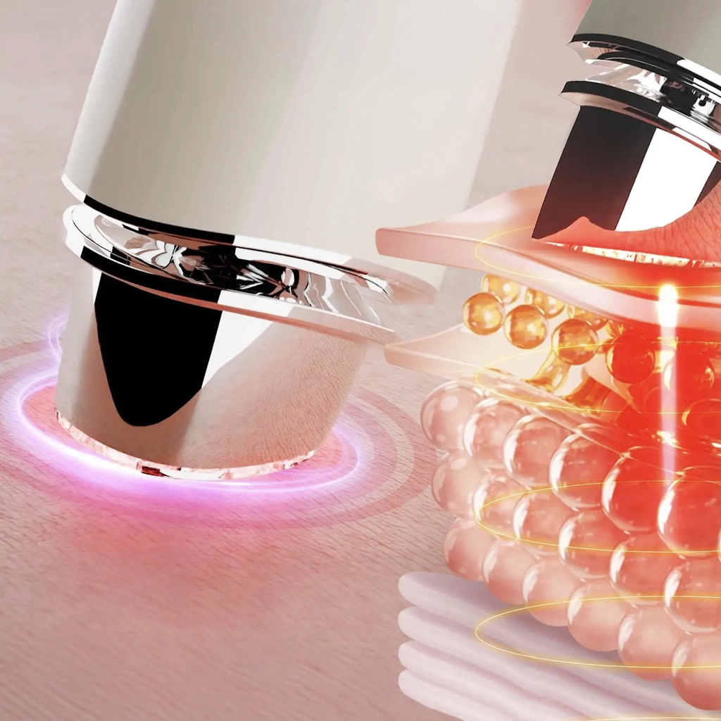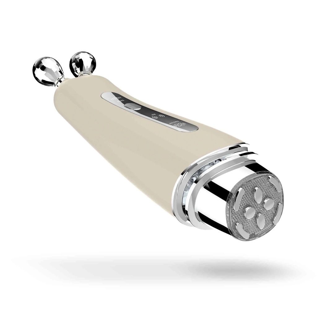 Diamantni masažni nastavki za natančno oblikovanje linij in ploščata glava z osmimi točkami za pojasnitev, pomiritev in podporo mikrocirkulacije s pomočjo svetlobe in vibracij.