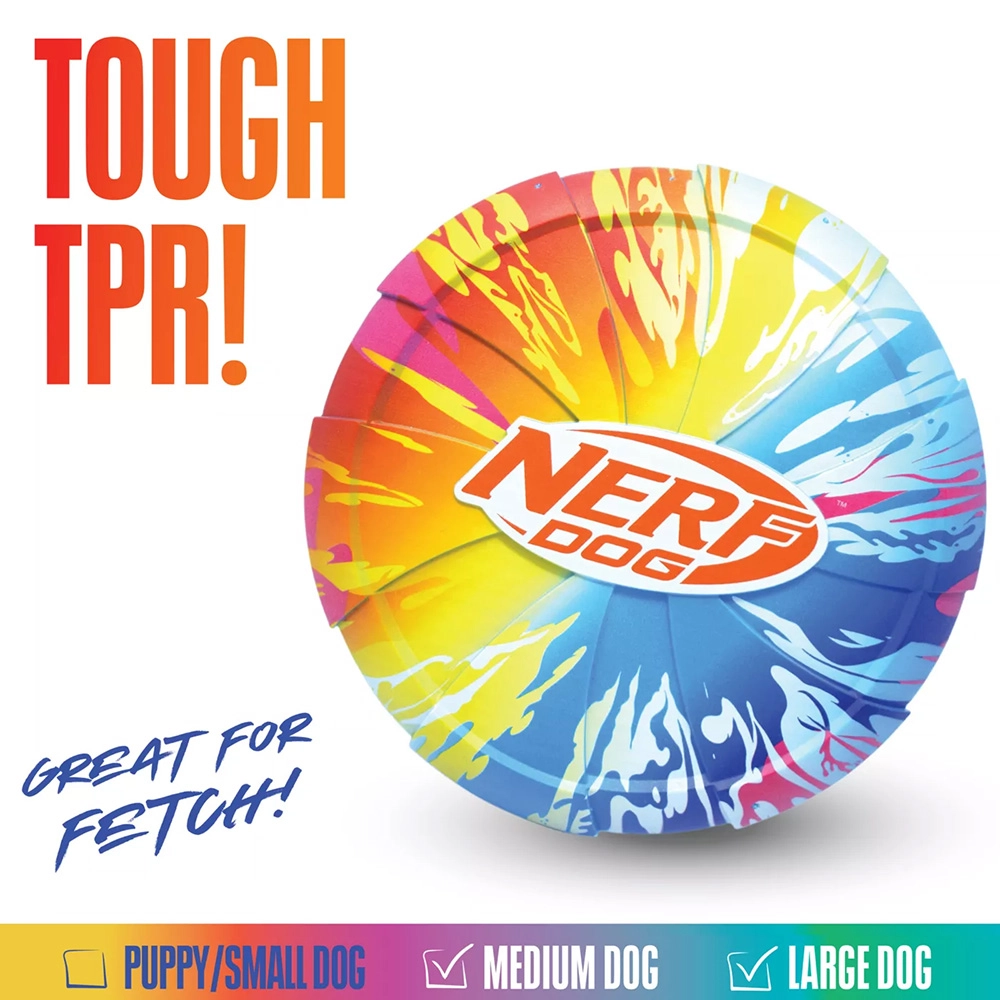 Leteči disk Nerf Dog je zasnovan za hitro in zabavno igro na prostem. Termoplastična guma (TPR) združuje vzdržljivost in prožnost, zato je ob ujetju prijazna do pasjih zob in dlesni. Zahvaljujoč ergonomični teksturirani površini se disk dobro meče, pes pa ga zlahka zagrabi tudi v zraku.