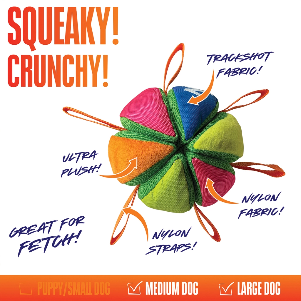 Zahvaljujoč več najlonskim trakovom je žogo enostavno prijeti, nositi in vleči. Posebni žepi za priboljške dodajo nagrado igri in podaljšujejo zabavo. Ojačano blago Trackshot in močni šivi zagotavljajo izjemno trpežnost tudi pri intenzivni uporabi.