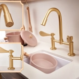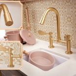 Globoko korito s kovinsko zlato pipo in dvojnima ročajema spodbuja igro pomivanja in priprave. Praktične police in omarice poskrbijo, da je vse pri roki.
