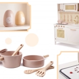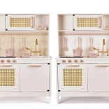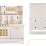 Ta lesena kuhinjica, navdihnjena z retro in boho slogom, navduši z elegantno kombinacijo bele, kremne in zlatih detajlov. Večina elementov je iz lesa/MDF, površina je gladko pobrušena in prebarvana z netoksičnimi barvami za varno igro. Vrtljivi gumbi, odpirajoča se vratca in kljukice za pripomočke vabijo k raziskovanju ter učijo otroke reda in organizacije.