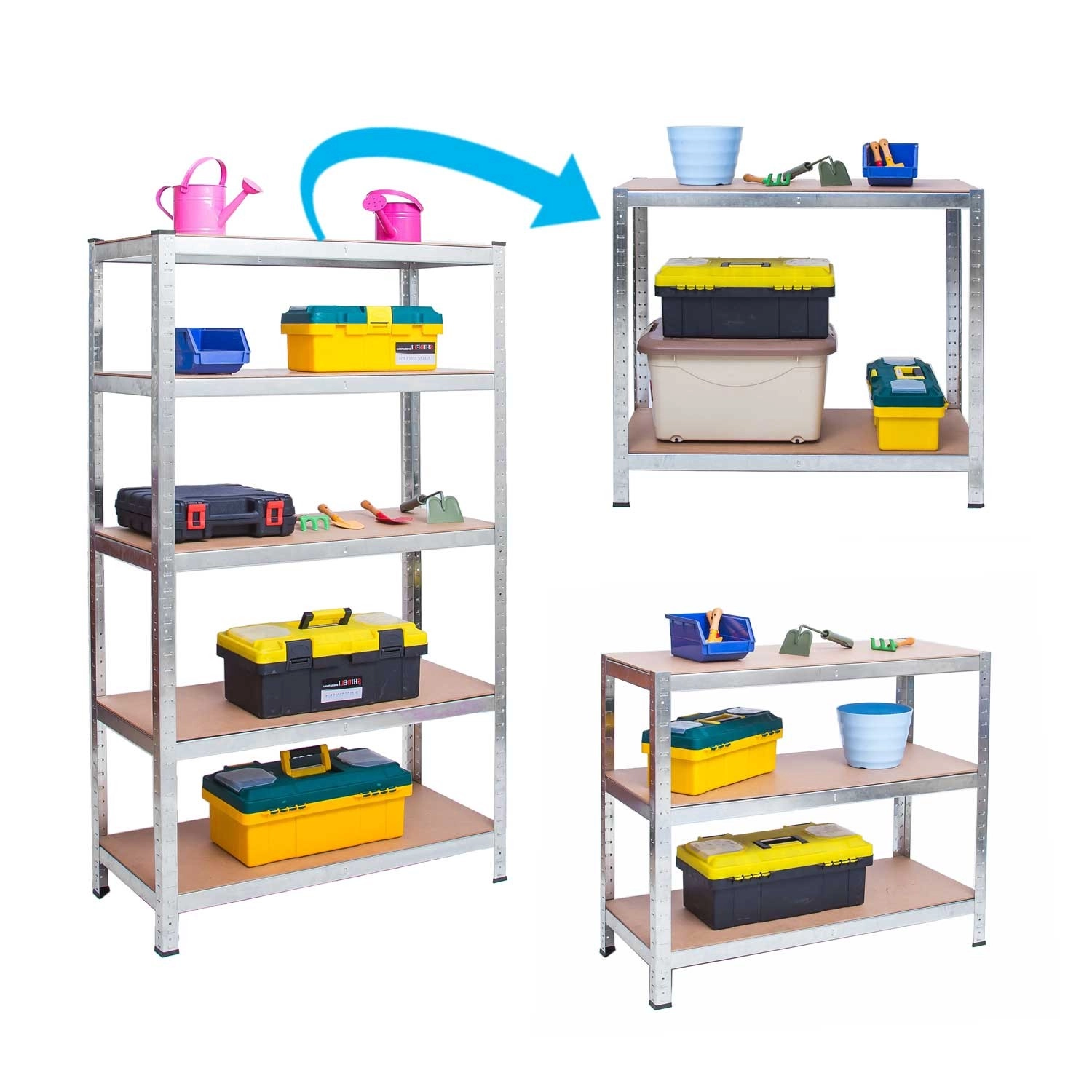 Police je mogoče po višini nastaviti v korakih po 40 mm, celoten sklop pa razdeliti na dva manjša. Tako enostavno izkoristite prostor v garaži, delavnici ali kleti.