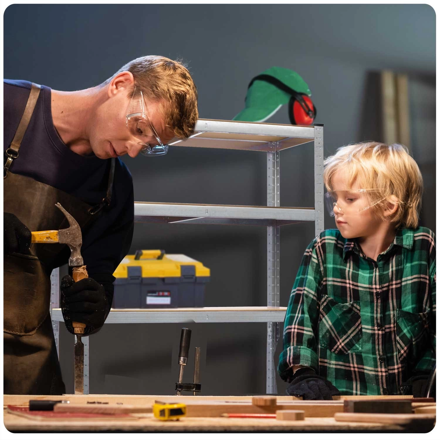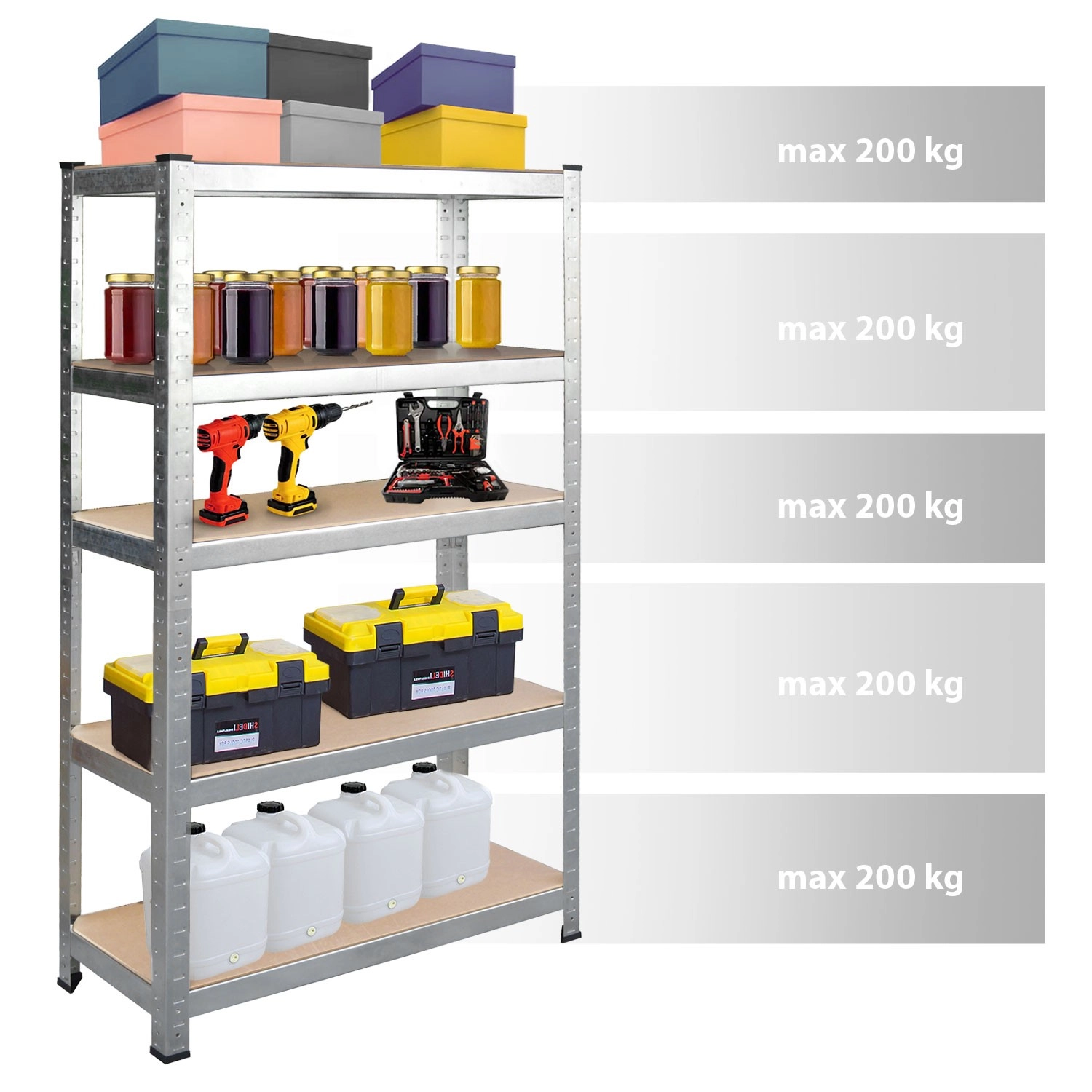 Regal HUMBERG je zasnovan za vsakodnevne obremenitve in pregledno shranjevanje orodja, škatel in zalog. Galvanizirani jekleni profili debeline 0,8 mm zagotavljajo izjemno stabilnost in dolgo življenjsko dobo, medtem ko pet polic iz MDF debeline 5 mm s sredinskimi ojačitvami varno nosi težke predmete. Brezvijačni sistem omogoča hitro in preprosto montažo brez orodja.