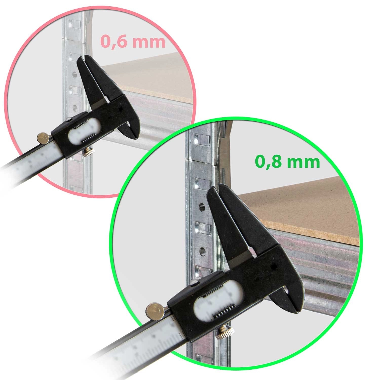 Galvanizirani jekleni profili debeline 0,8 mm in sredinske ojačitve polic zagotavljajo visoko stabilnost in dolgo življenjsko dobo tudi pri polni obremenitvi.