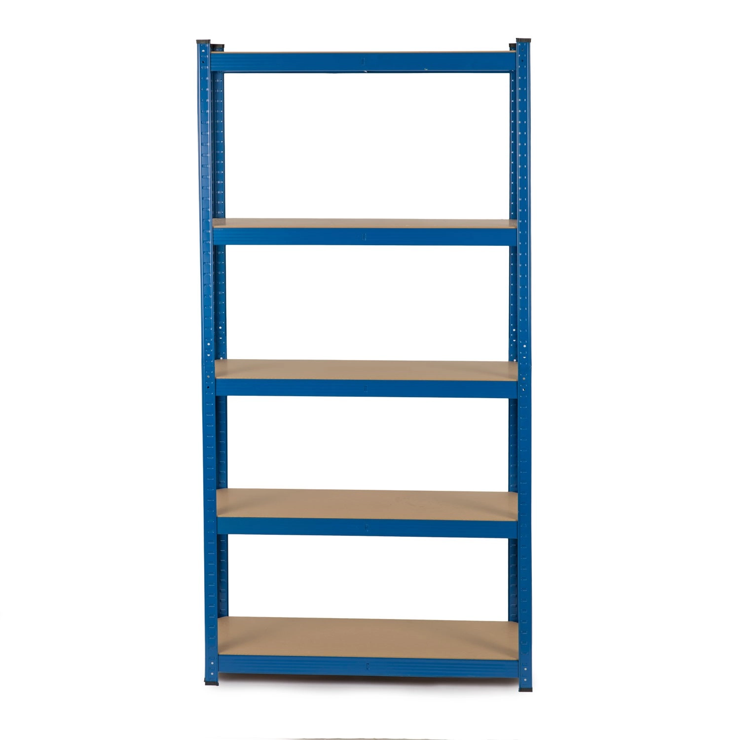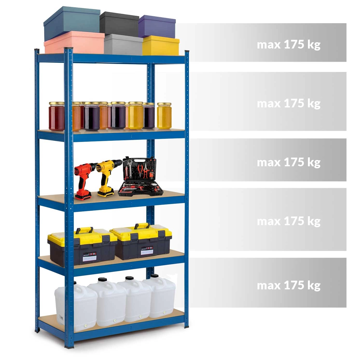 Pet MDF polic s sredinskimi ojačitvami prenese do 175 kg na polico (skupaj 875 kg). Idealno za težko orodje, zaboje in zaloge v skladišču ali delavnici.