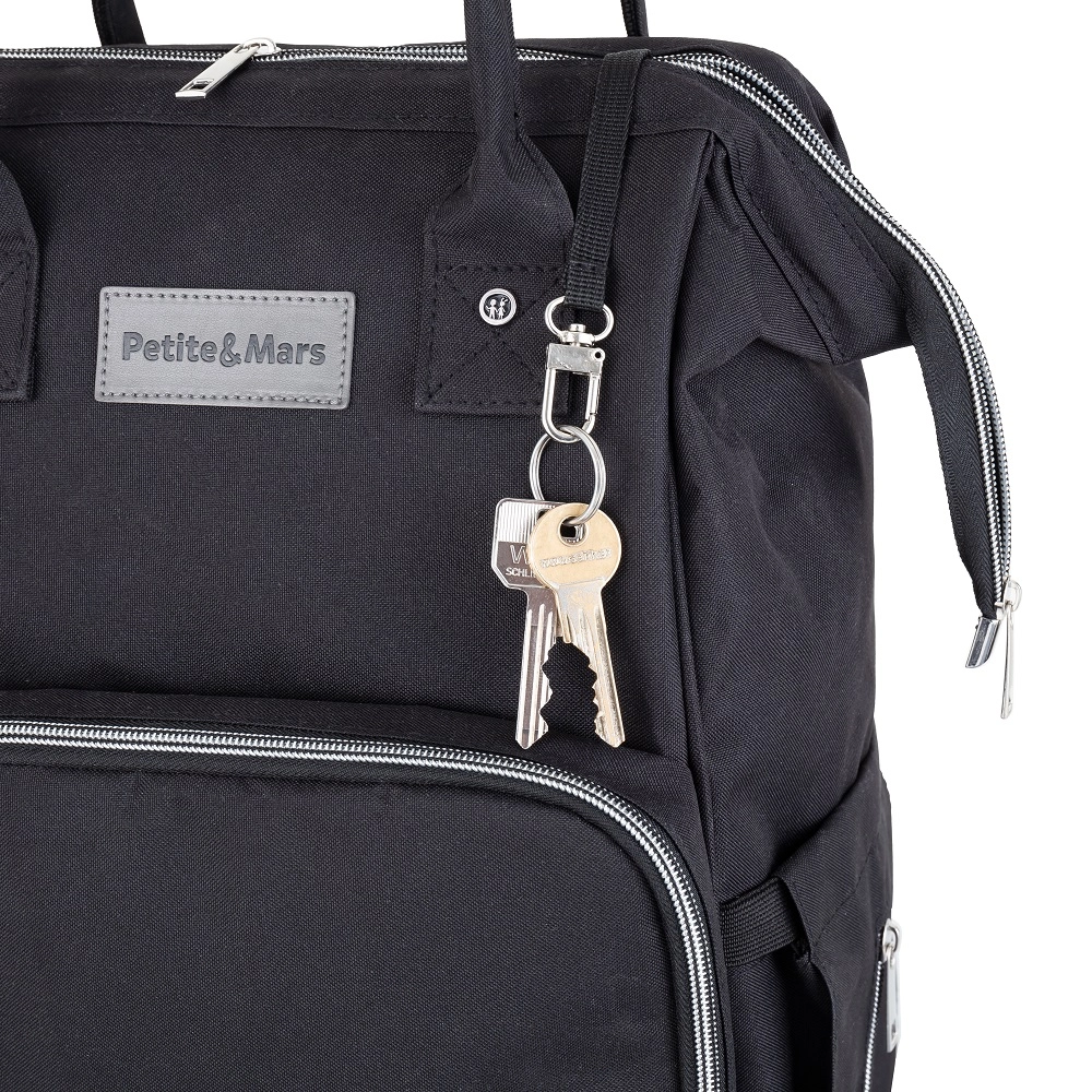 Premišljena razdelitev ponuja 11 lahko dostopnih žepov, vključno z 2 termalnima žepoma za ohranjanje temperature stekleničk, vodotesnim žepom za mokra oblačila ali krpice, zunanjim žepom za stekleničko in zunanjim žepom za vlažilne robčke. Ne manjkajo vrvica za ključe, zadnji zadržni vhod za hiter dostop in trak za nataknitev na ročaj kovčka za potovanja.