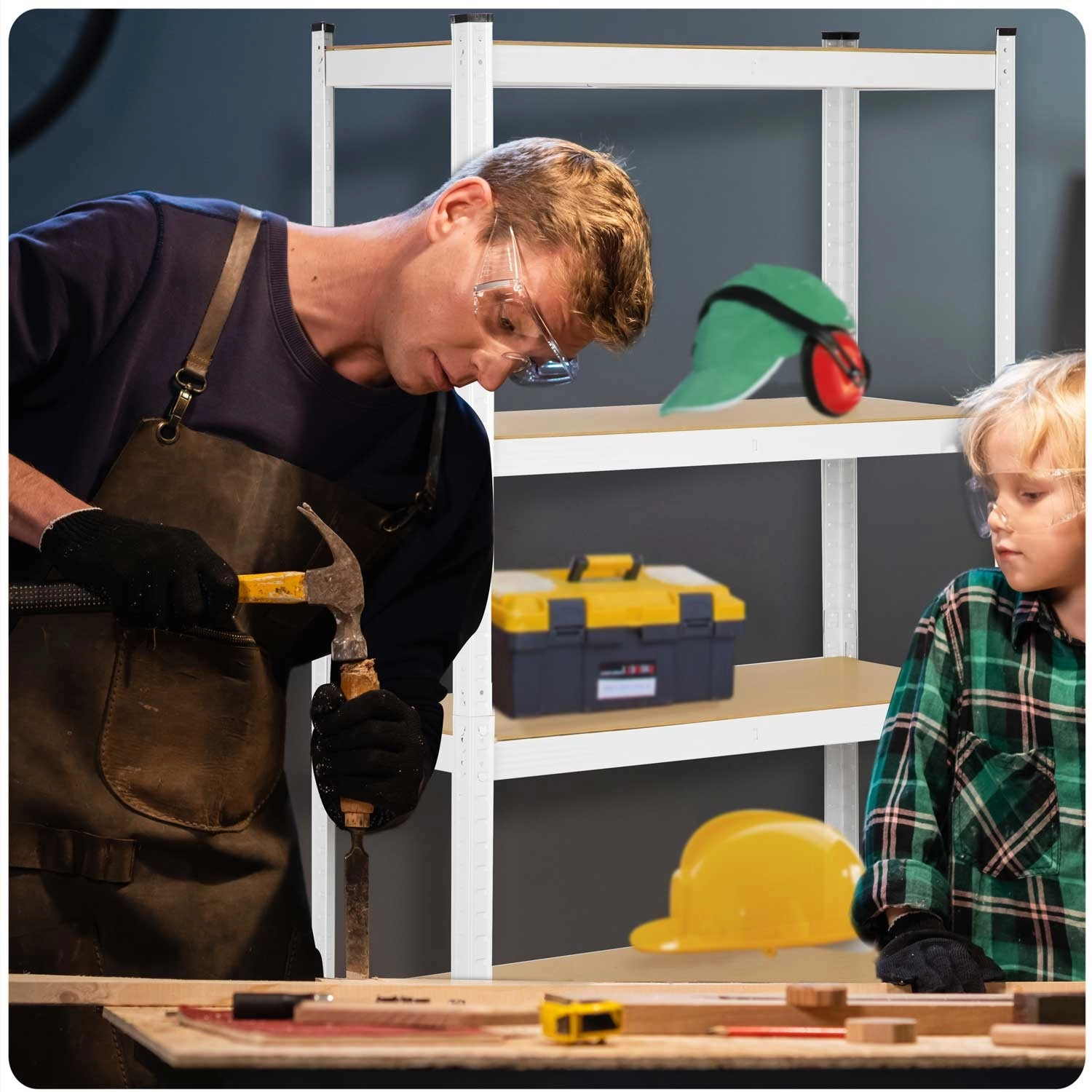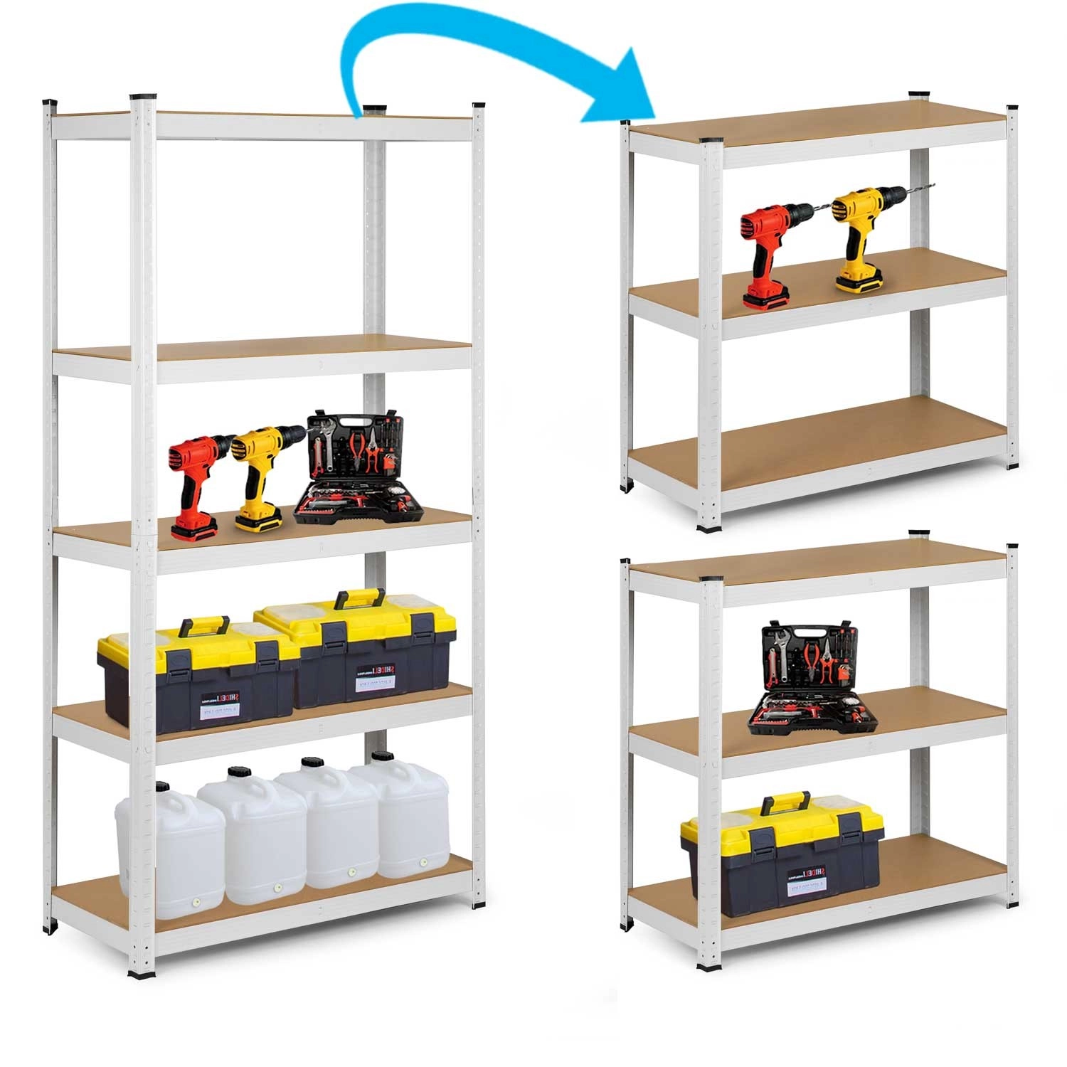 Univerzalen in stabilen kovinski regal HUMBErg v beli barvi ponuja 5 trdnih polic iz MDF, nosilnost do 875 kg in hitro montažo brez vijakov. Zahvaljujoč nastavljivi višini polic in možnosti razdelitve na dva manjša regala je popoln za garažo, klet, arhiv in delavnico.