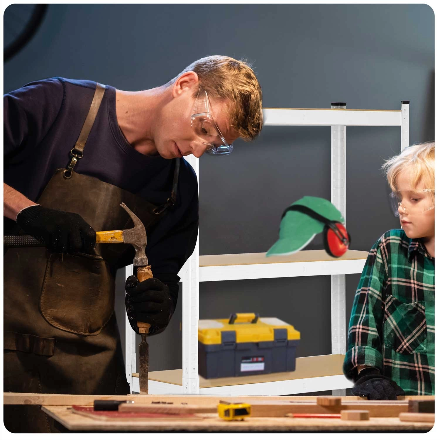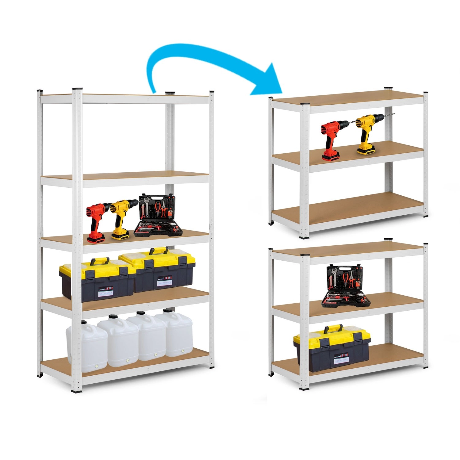 Univerzalna kovinska polica HUMBREG v beli barvi ponuja 5 trdnih MDF polic, nosilnost do 625 kg in brezvijačno sestavljanje na klik. Zahvaljujoč nastavljivi višini polic, zaščitnim zaključkom nog in zaobljenim robovom je idealna za garažo, klet, arhiv in delavnico. Možno jo je tudi razdeliti na dve manjši polici ali uporabiti kot delovno mizo.