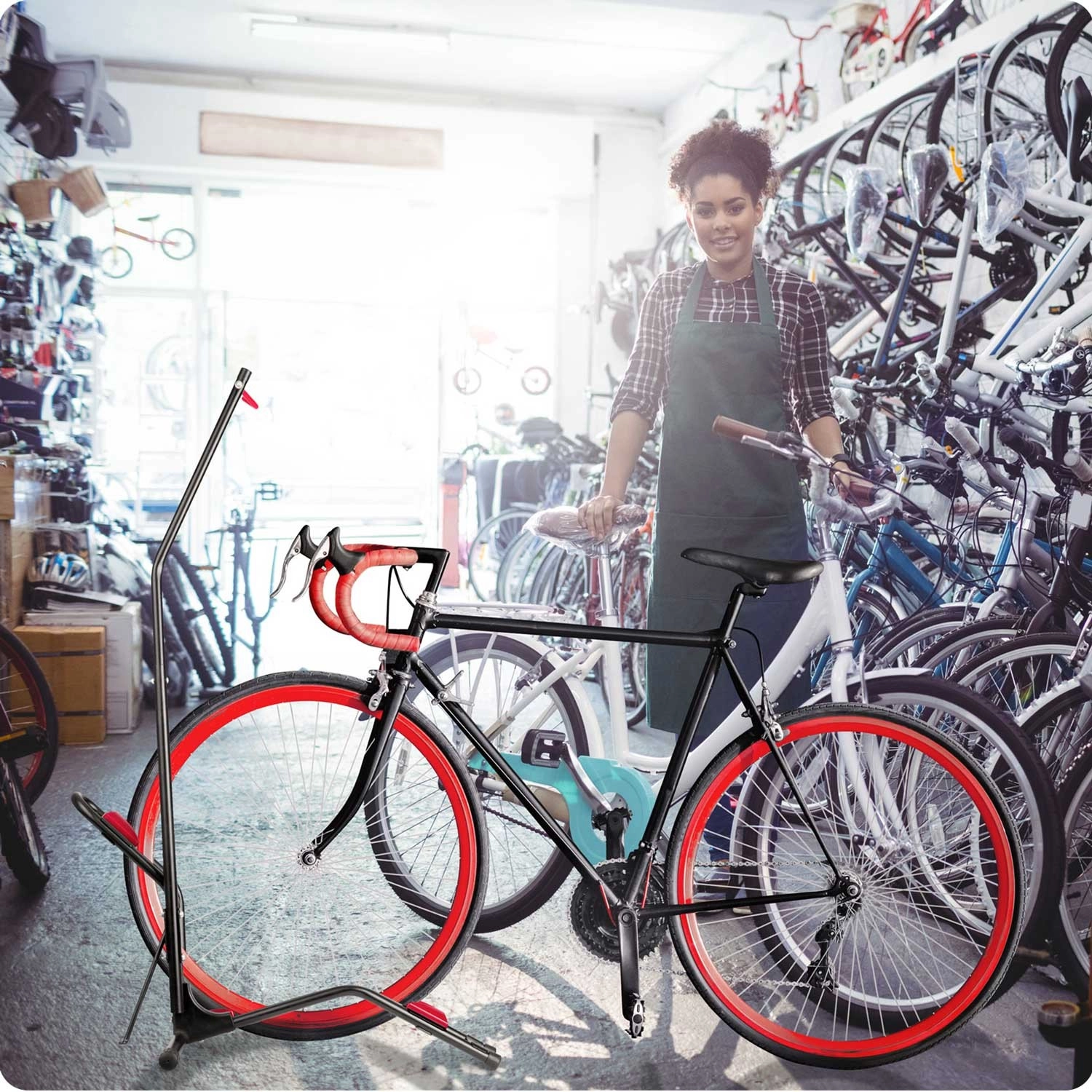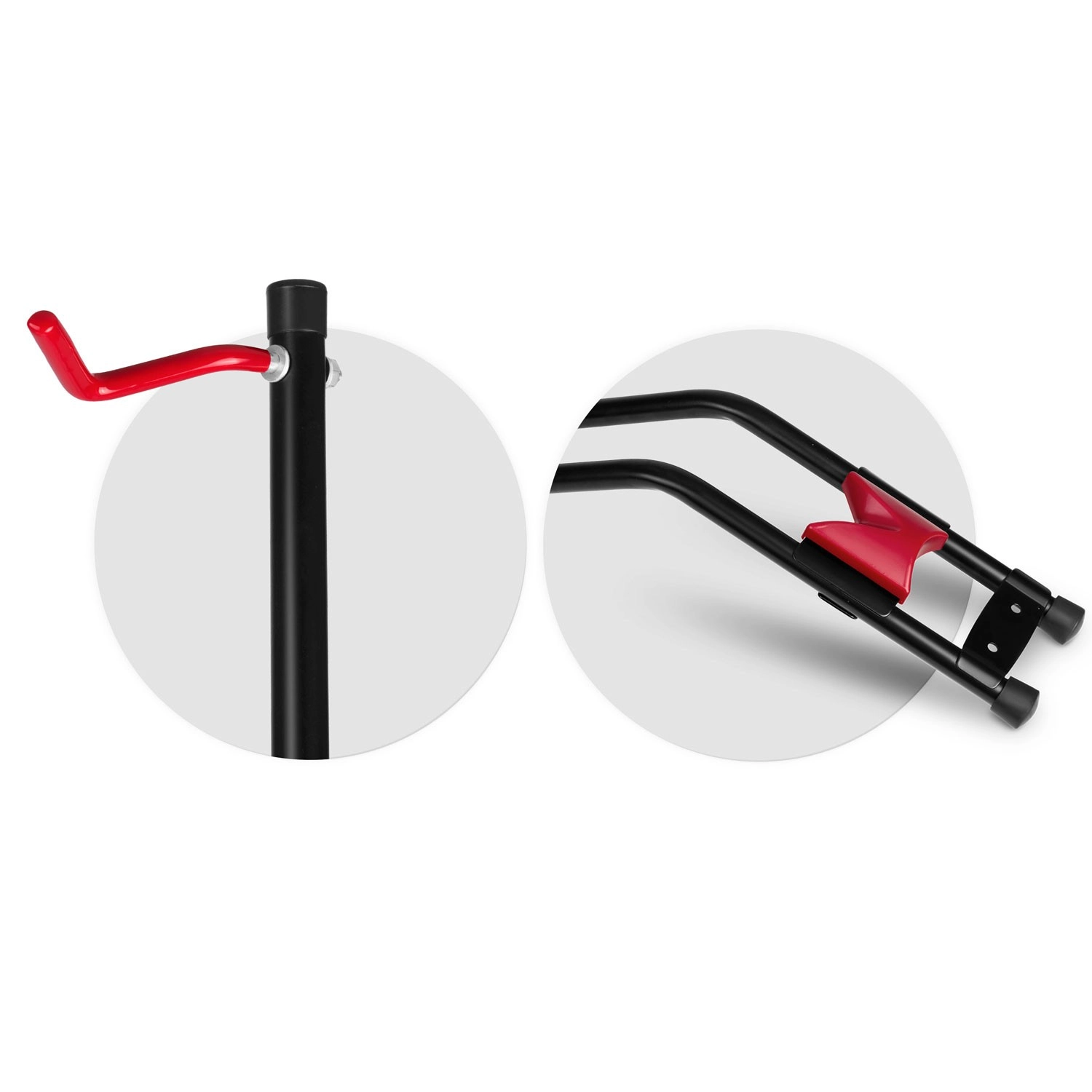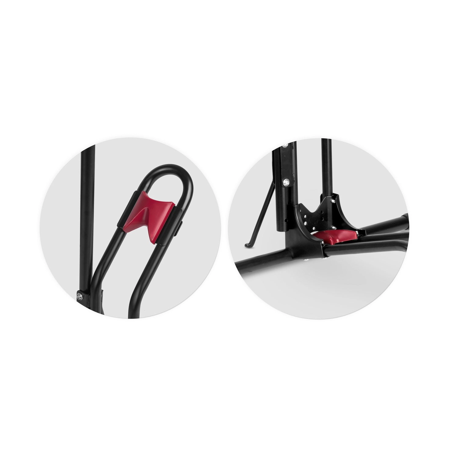 Široka osnova, naslonska zibelka in kavlji z zaščito držijo kolo trdno na mestu brez nevarnosti prevrnitve med servisom ali shranjevanjem.