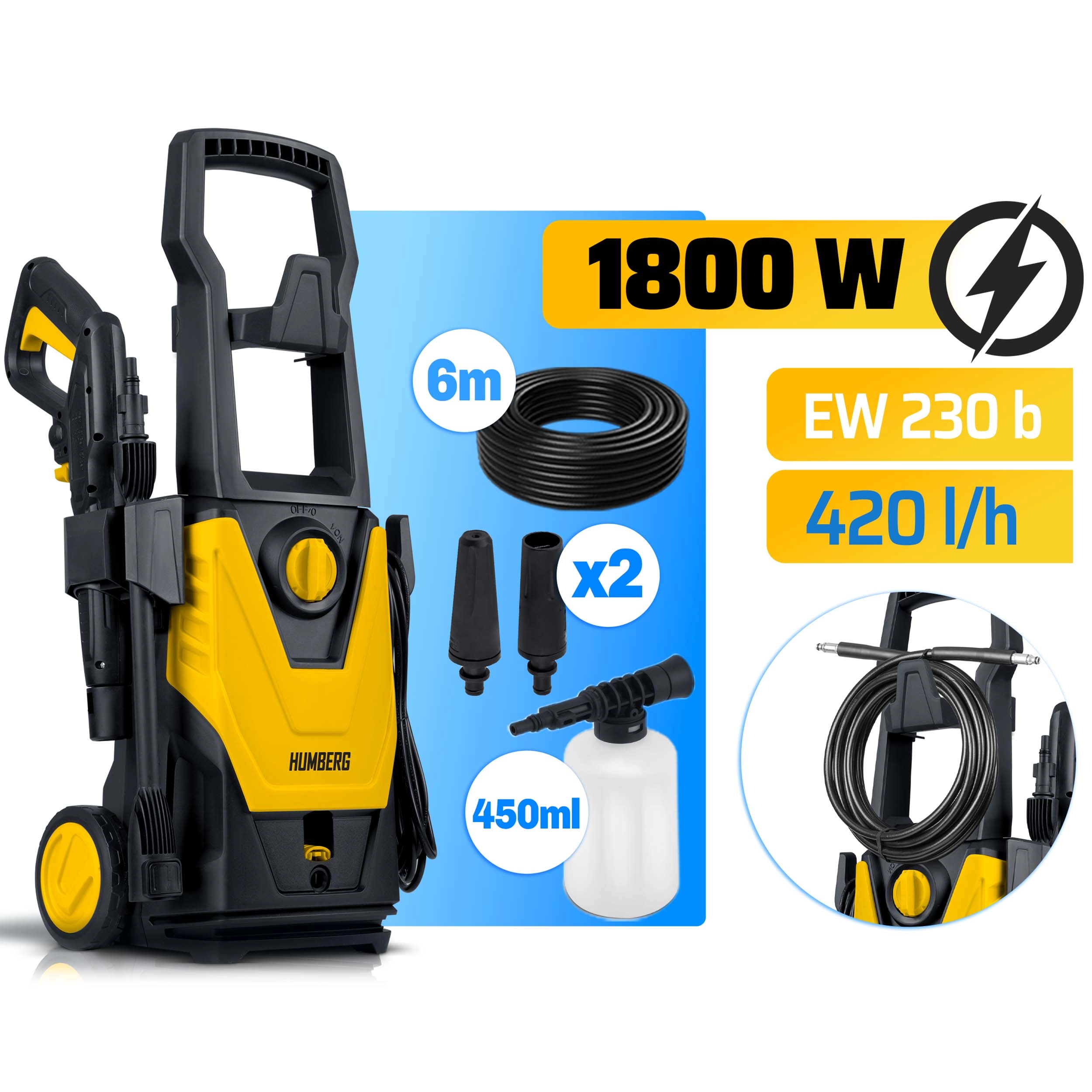 Kompakten in zmogljiv visokotlačni čistilnik HUMBERG HM-300 z motorjem 1800 W, aluminijasto samosesalno črpalko in tlakom do 135 bar zlahka očisti avto, tlakovanec in teraso. Ponuja nastavljivo šobo, turbo šobo TurboStream™, penilec (450 ml), 6 m visokotlačno cev in 5 m napajalni kabel. Sistem StopAndSafe™ varčuje z vodo in energijo ter podaljšuje življenjsko dobo naprave, možnost dovoda tople vode do 60 °C pa poveča učinkovitost čiščenja.