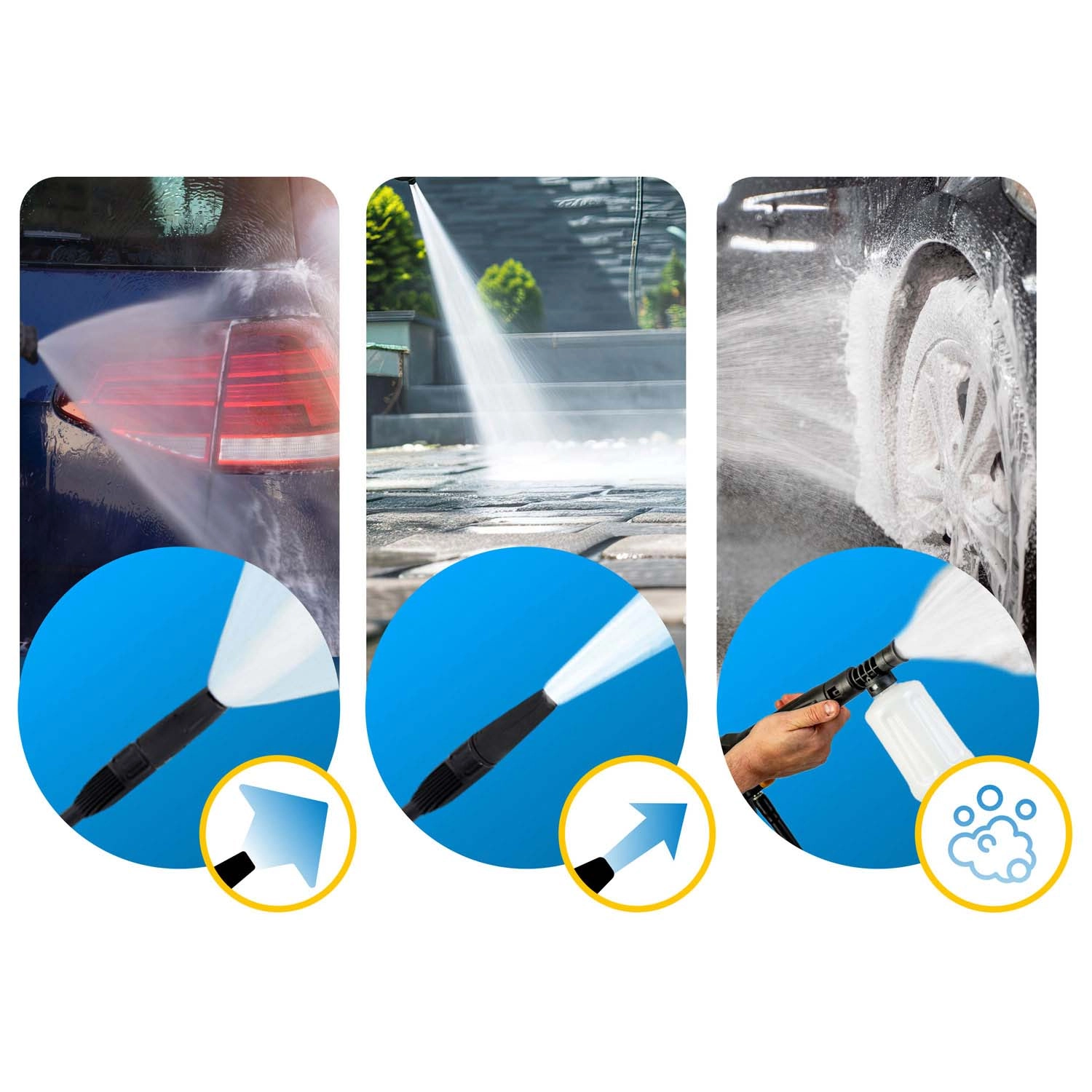 Preklopite na turbo šobo za koncentriran curek pri najbolj trdovratni umazaniji ali izkoristite gladko nastavitev pahljačastega curka za nežno pranje karoserije in stekel.