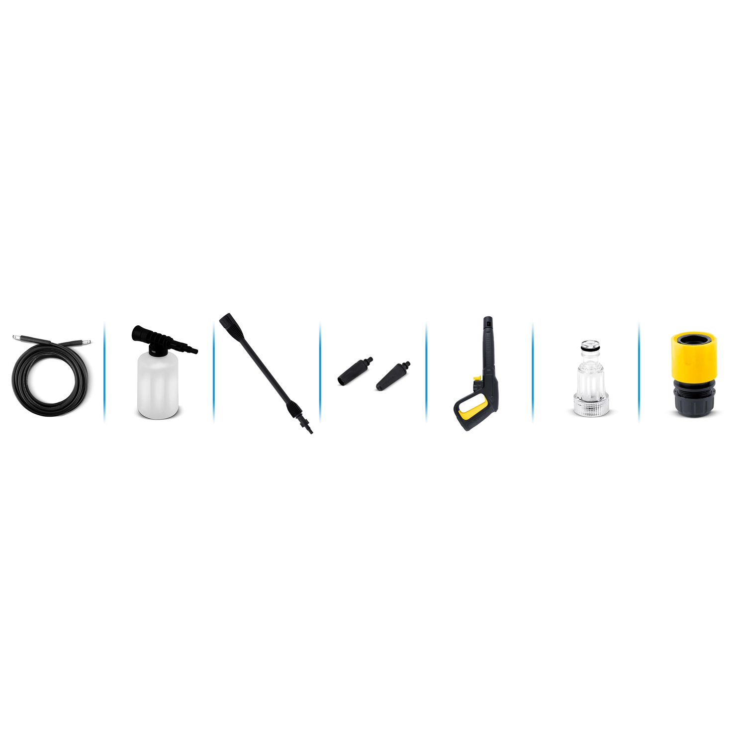 - lança z nastavljivo šobo, turbo šoba, 6 m visokotlačna cev, priključek za vodo, hitra spojka, posoda za detergent 450 ml, čistilna igla za šobe, 5 m napajalni kabel