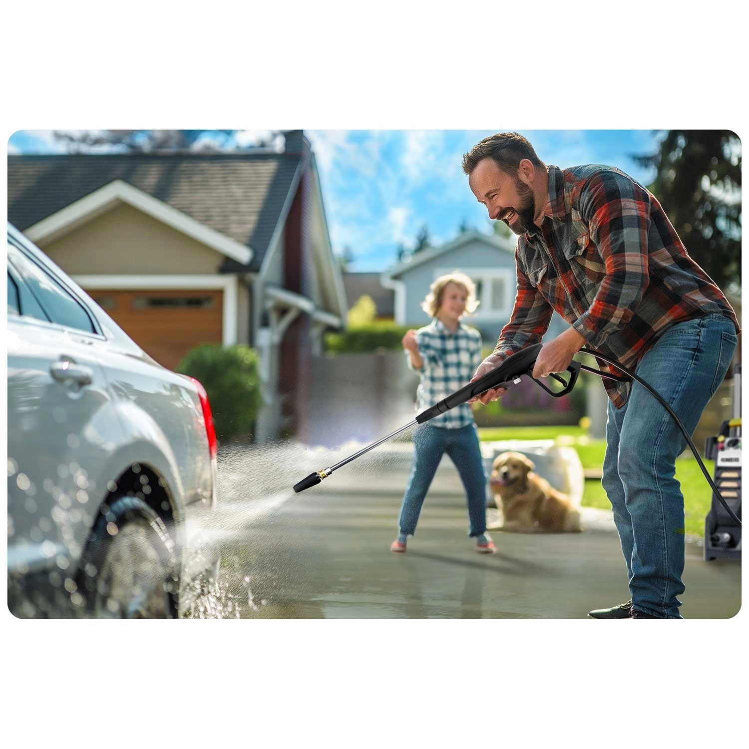 Štiri zamenljive šobe, turbo šoba, čistilec teras, 500 ml posodica za detergent in krtača za kolesa. V hipu preklapljajte med nežnim izpiranjem in močnim curkom.