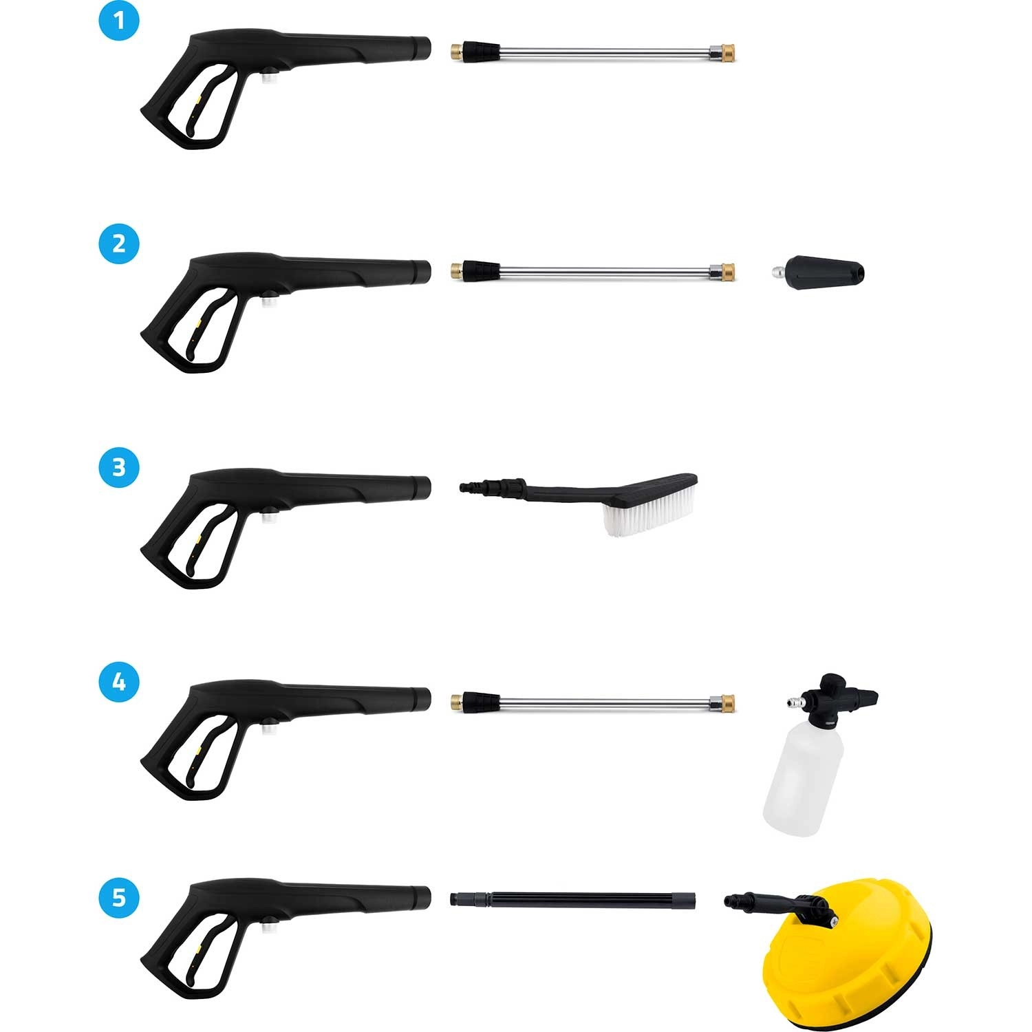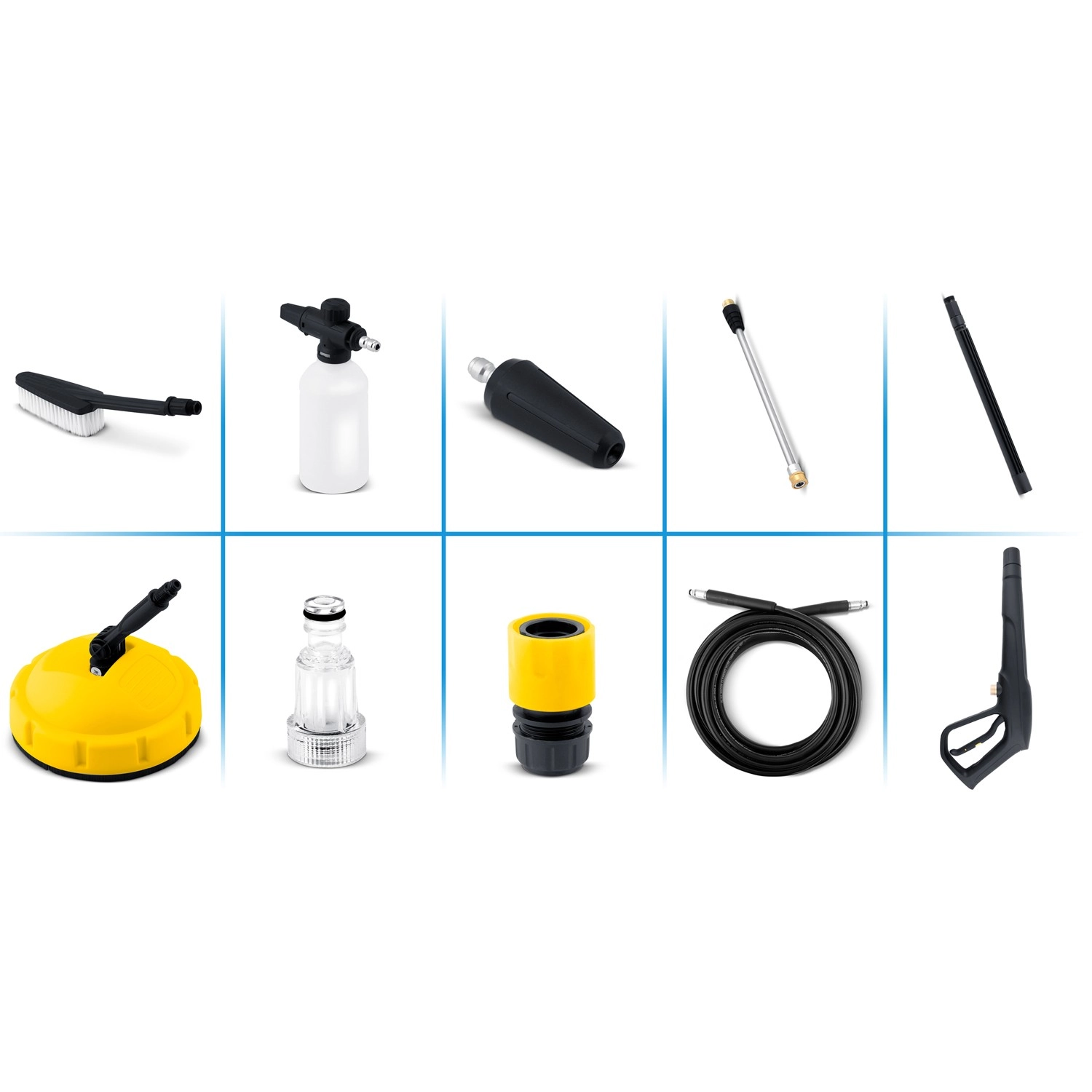 - pištola z regulacijo, turbo šoba TurboStream2, 4 kotne šobe (0°/15°/25°/40°), čistilec teras, krtača za kolesa, 500 ml posoda za detergent z regulacijo, vodni filter, hitra spojka, priključni konektor, čistilna igla