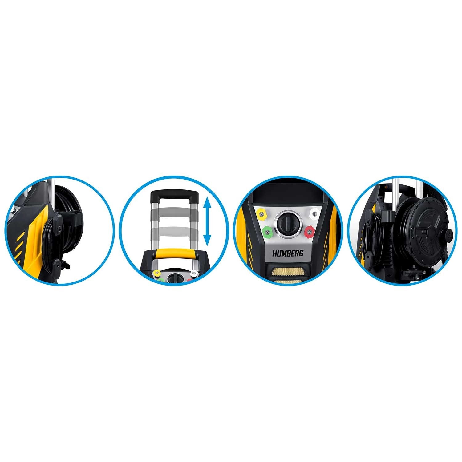 Kompakten električni visokotlačni čistilnik Humberg HM-302 ponuja moč 2500 W, največji tlak do 195 barov in pretok 480 l/h. Zahvaljujoč turbovozlju TurboStream2, sistemu StopAndSafe2 in bogatemu naboru dodatkov boste hitro in učinkovito očistili avto, teraso, poti in vrtno pohištvo. Praktični navijalni boben za cev, teleskopski ročaj in velika kolesa omogočajo enostavno upravljanje in udobno shranjevanje.