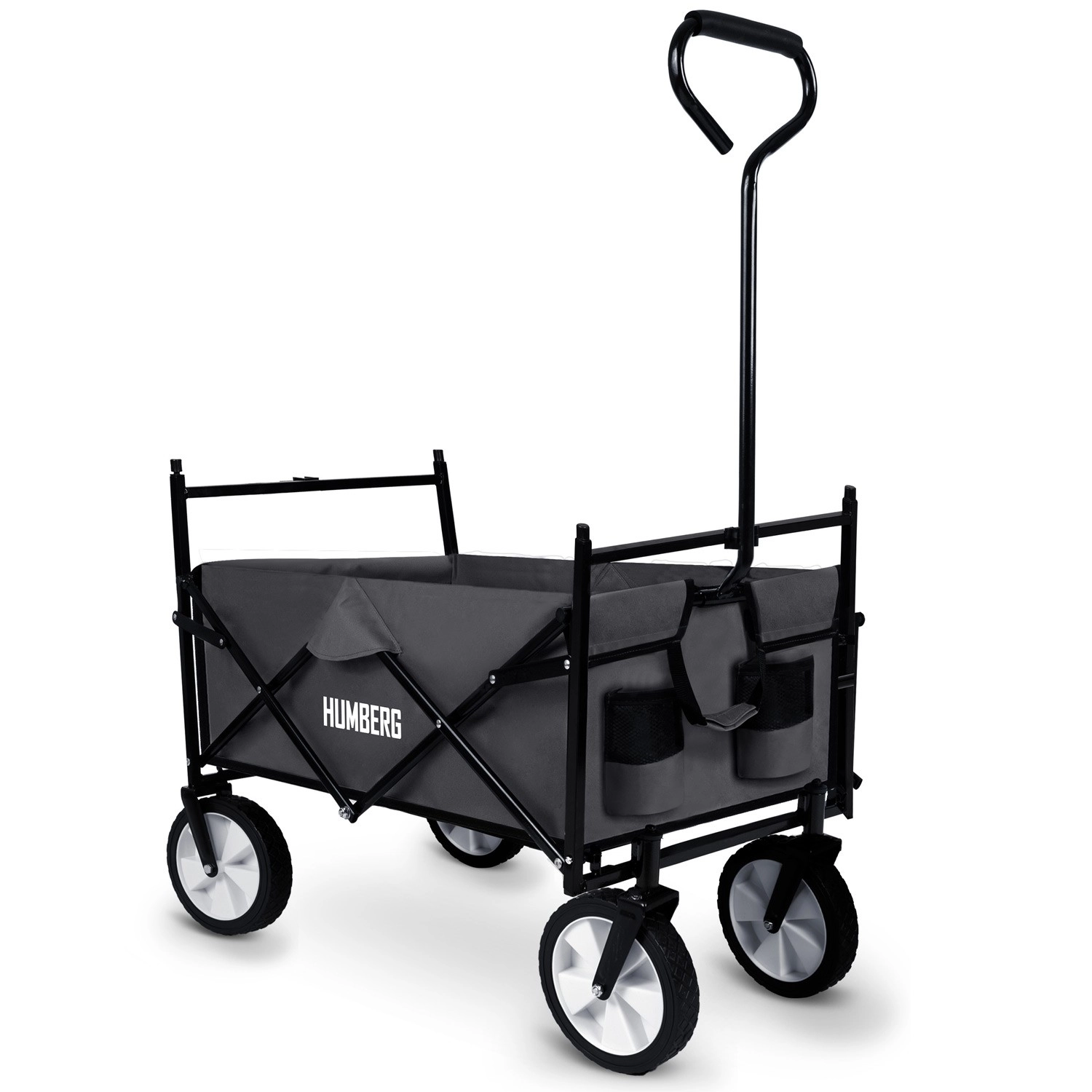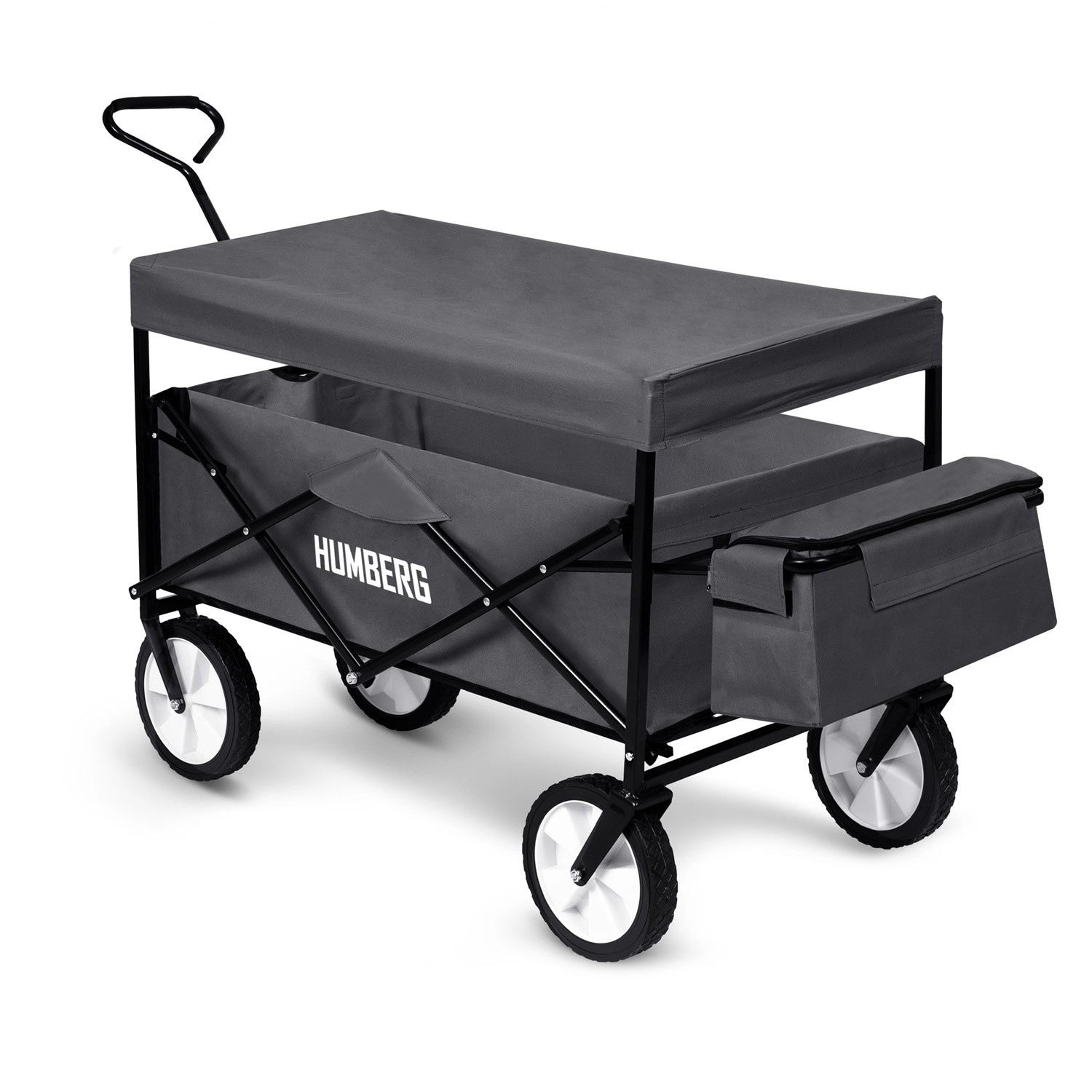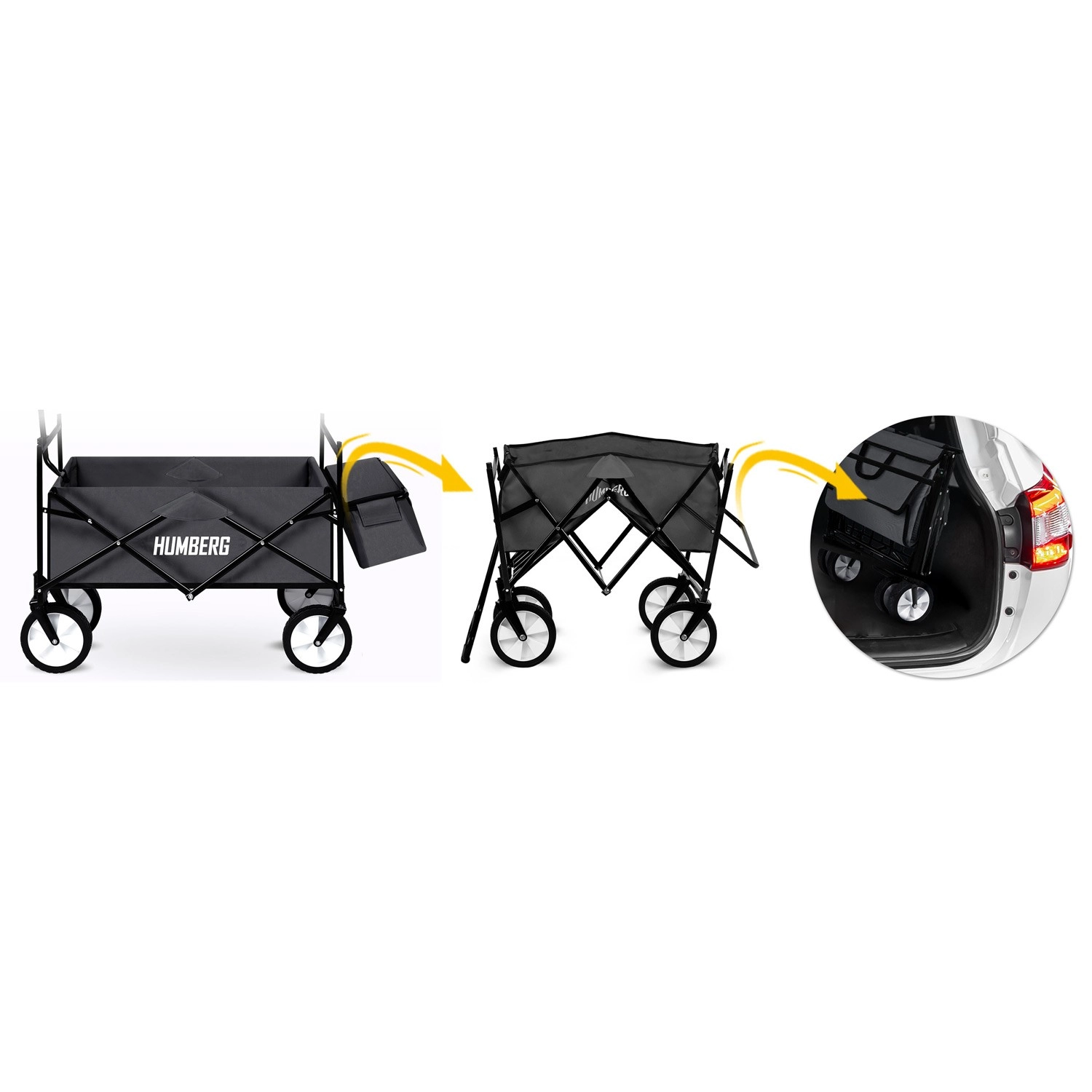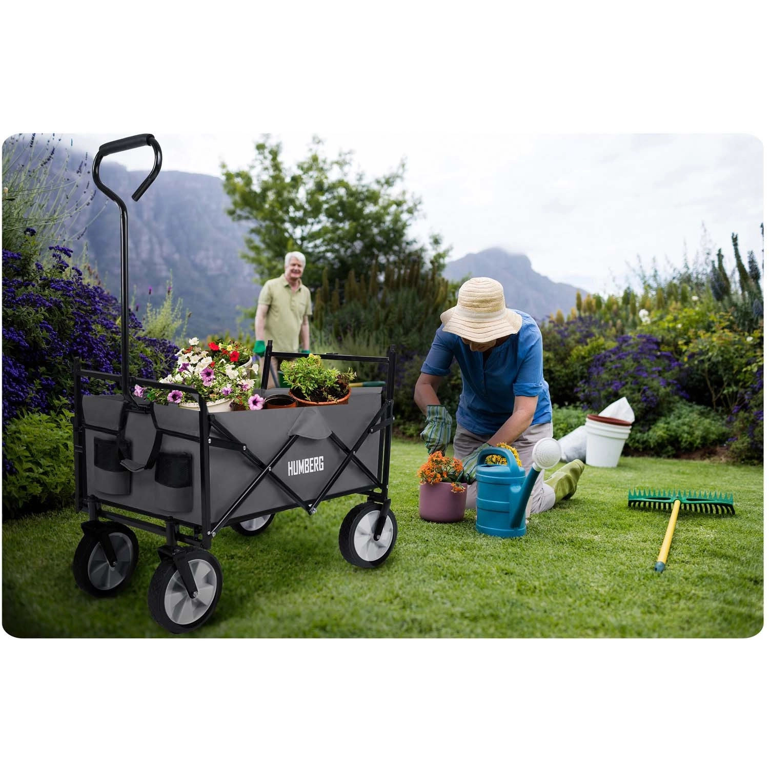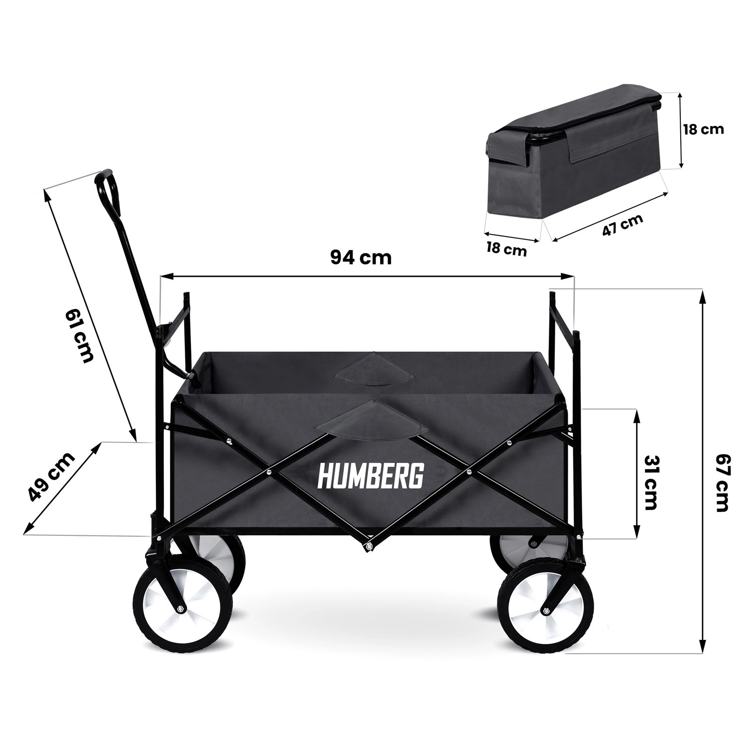 Praktičen zložljiv voziček HUMBERG s prostornino 80 l in nosilnostjo 90 kg olajša prevoz tovora na vrtu, izletih in na plaži. Ima nastavljivo strešico proti soncu in dežju, vzdržljiv jeklen okvir s prašnim lakiranjem, udoben teleskopski ročaj z nedrsečim premazom ter dodatni snemljiv žep na zadrgo za drobnarije. Sprednja vrtljiva kolesa zagotavljajo enostavno manevriranje, konstrukcija pa se hitro zloži v kompaktno velikost za preprosto prenašanje in shranjevanje.